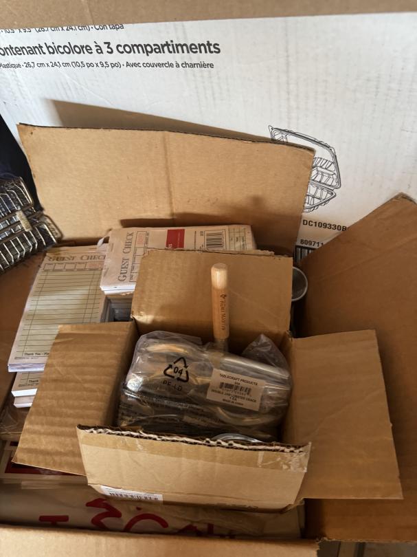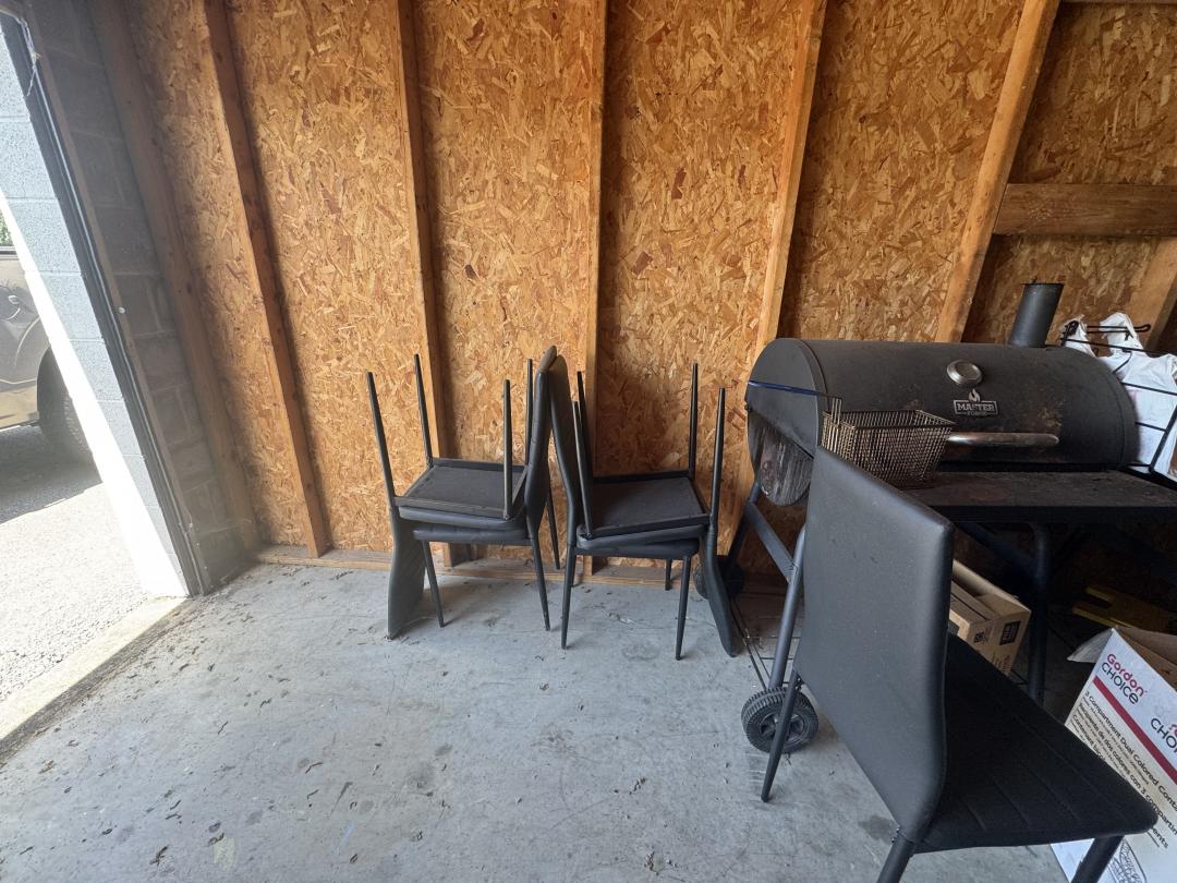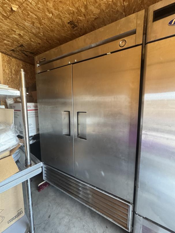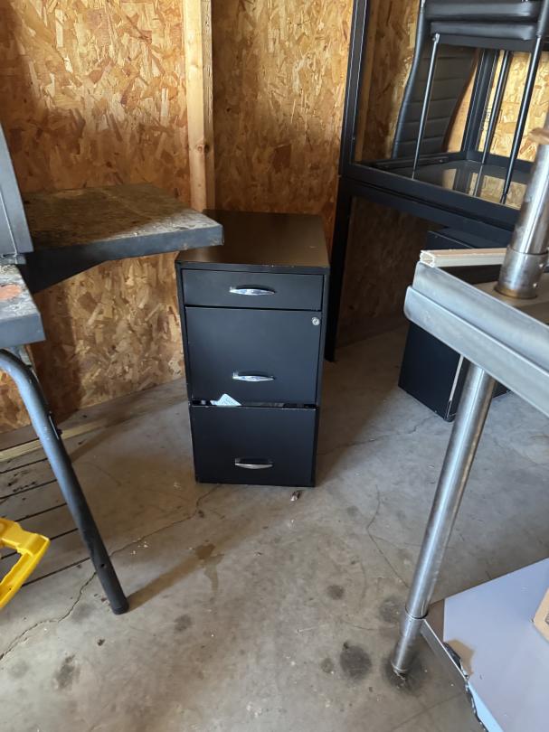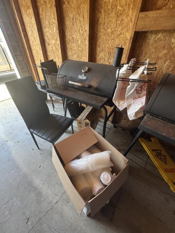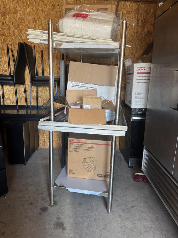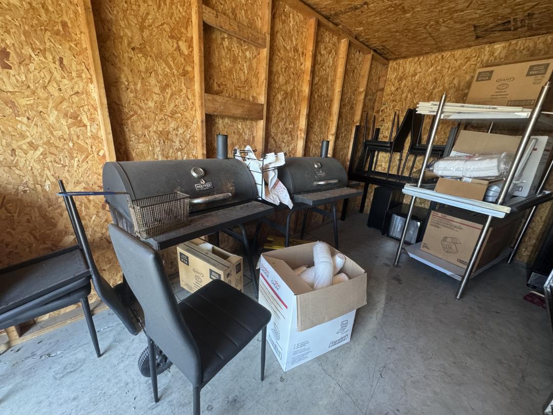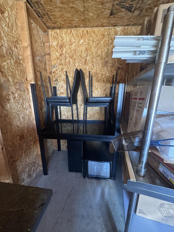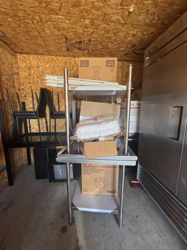 This unit appears to contain…Restaurant supplies. Table and chairs, appliances, 2 commercial refrigerators, 2 stainless steel prep tables, file cabinet, oven, 2 Master Forge grills, to go food containers.