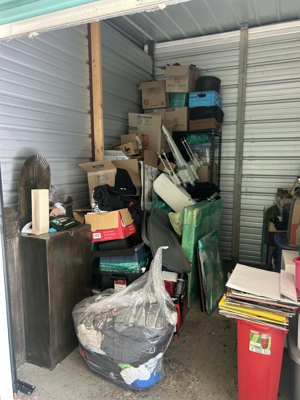 This unit appears to contain…Unit appears to have totes, boxes, wall pictures, clothes, shelving, coat, albums and other miscellaneous items