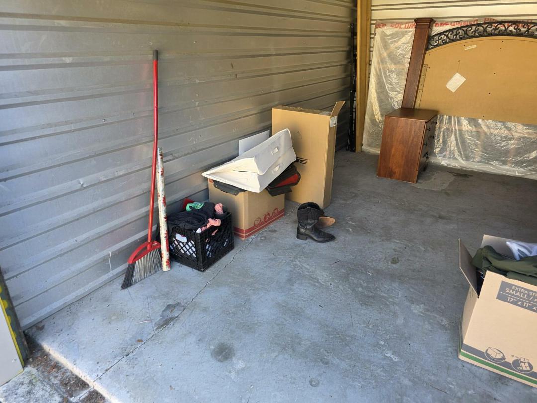 This unit appears to contain…Soft guitar case, bedding, headboard, holiday decor, bags, boxes, clothing boots.