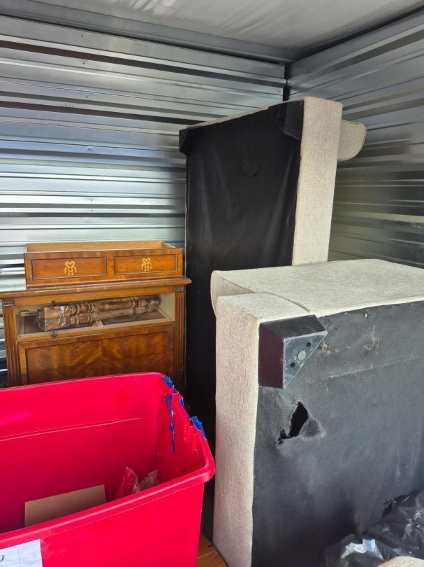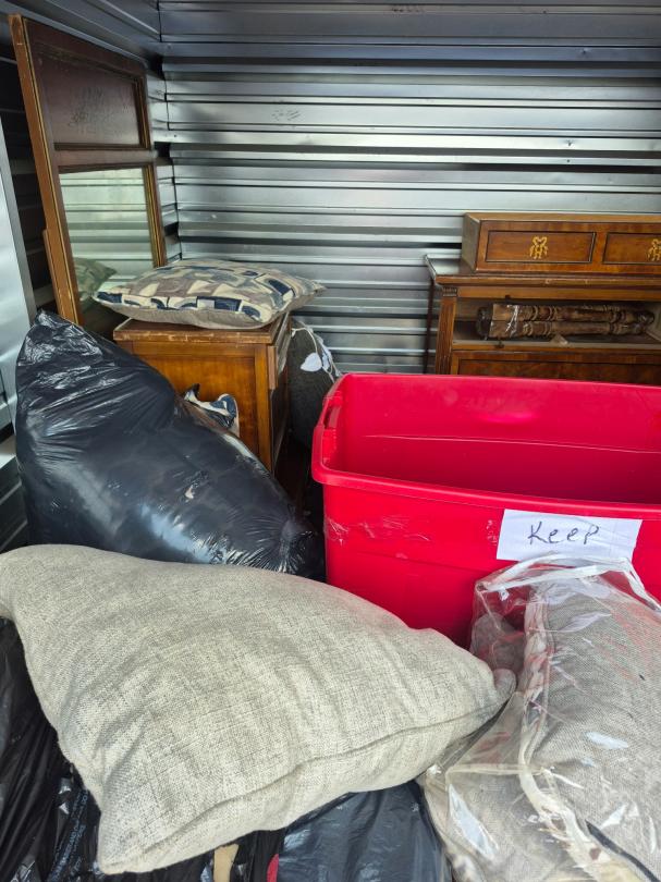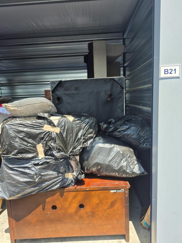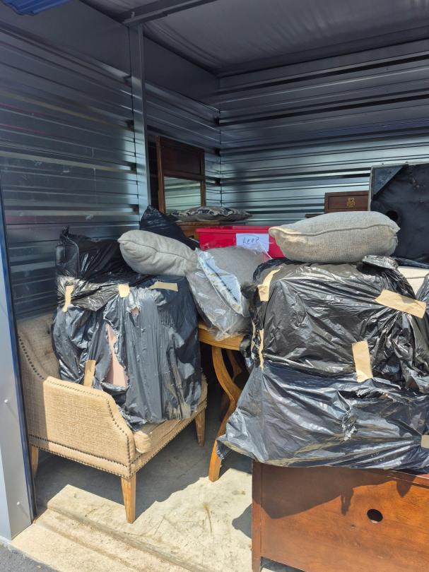 This unit appears to contain…chair, table, Tv stand, couch cushions, mirror, dresser, chest of drawers, couch, plastic tote, looks like mostly furniture