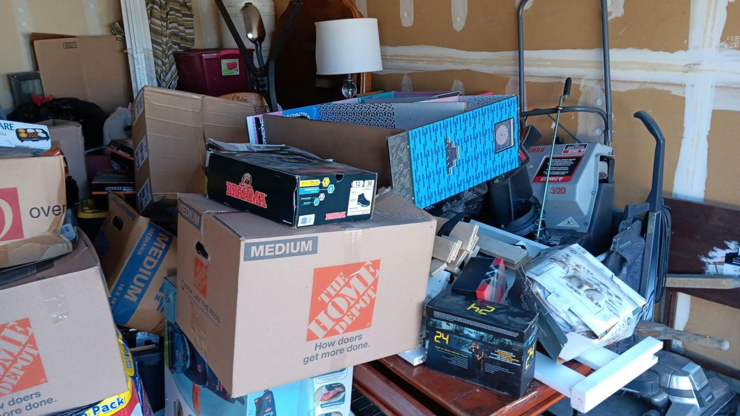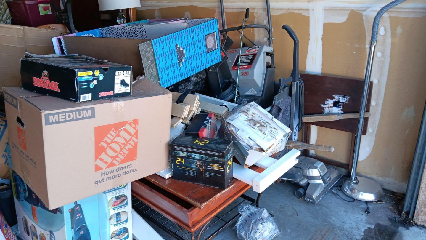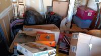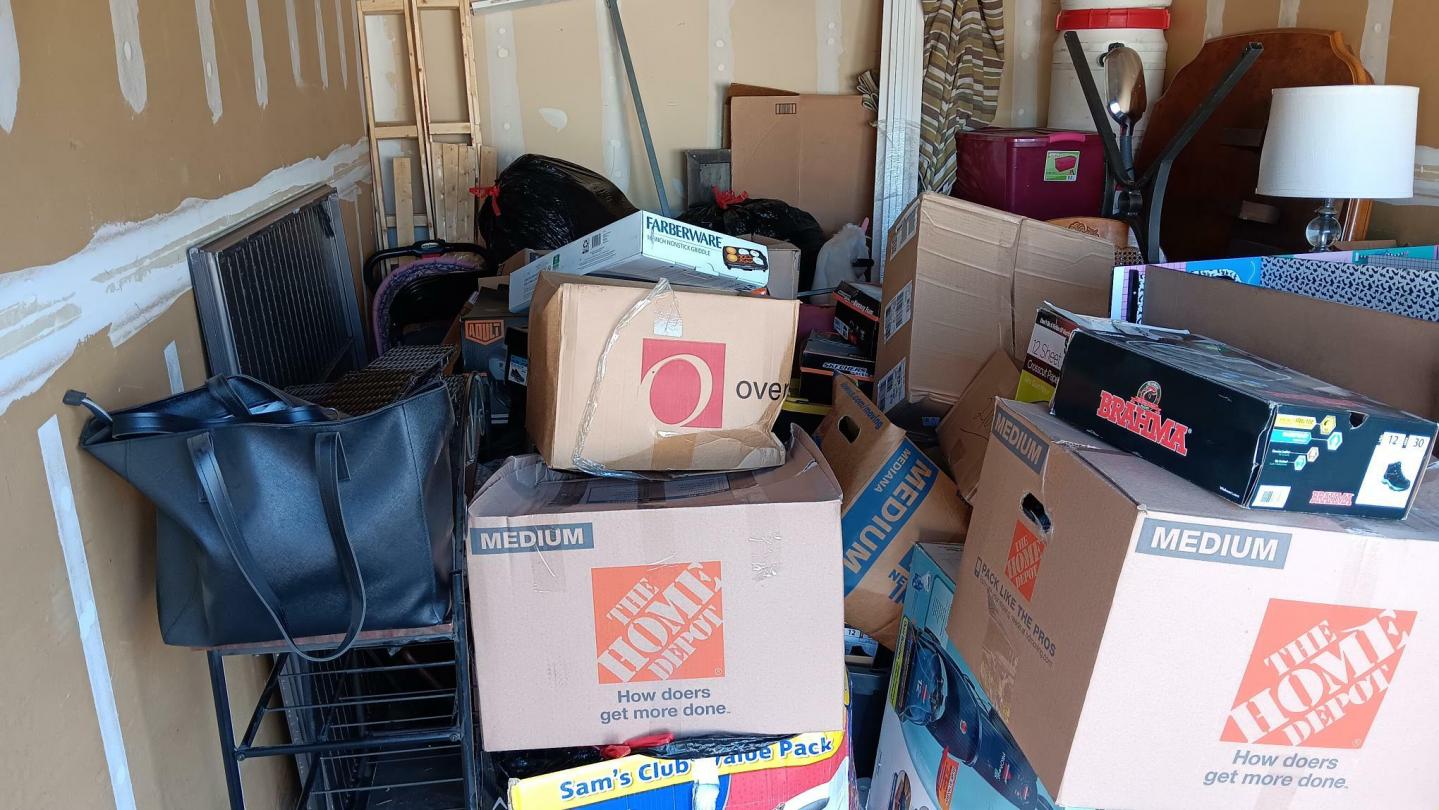 This unit appears to contain…boxes, totes, vacuum, brand new unopened kitchen supplies. shoe boxes. toys.
