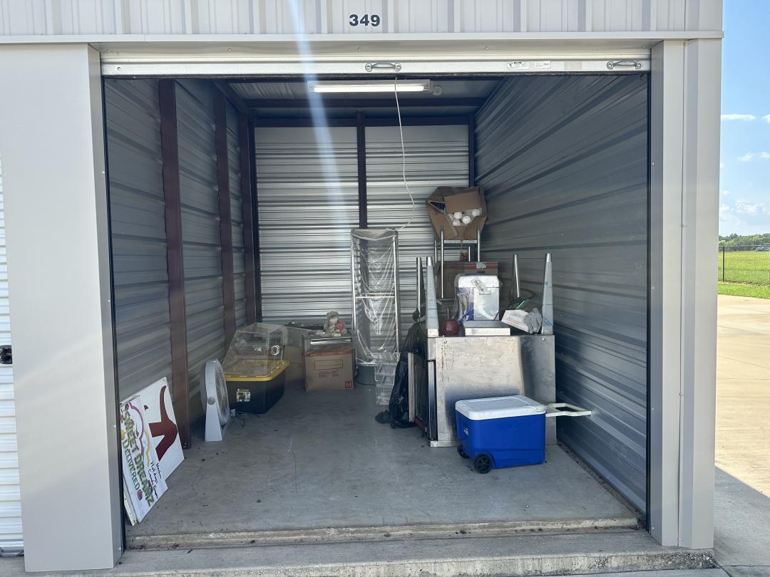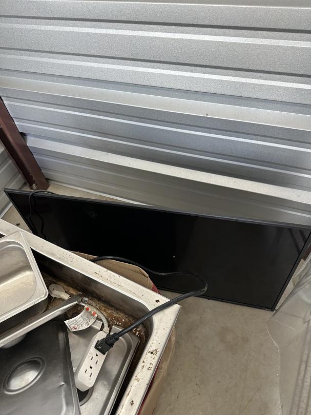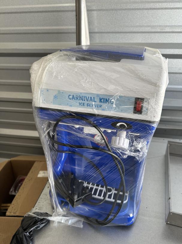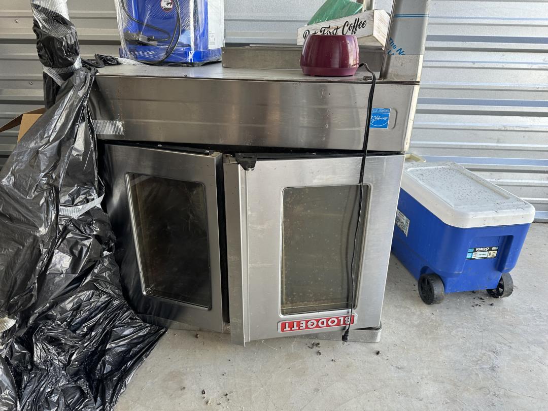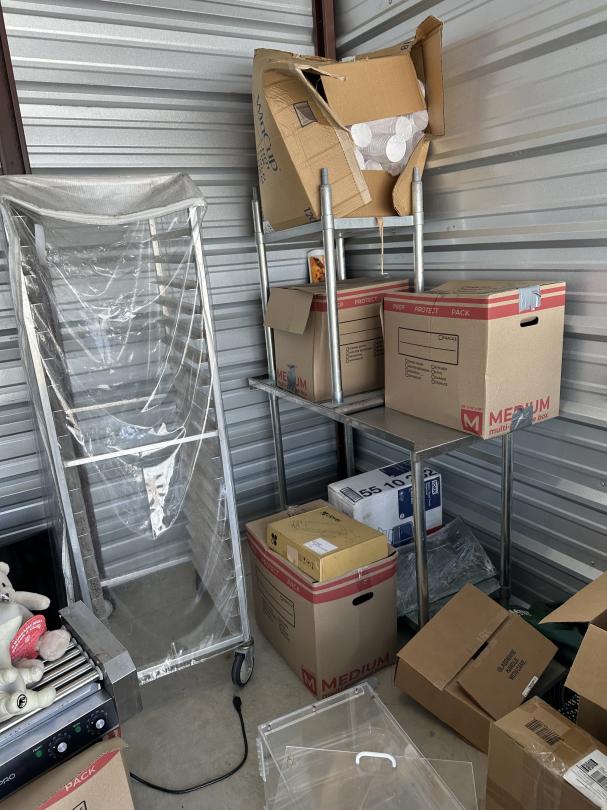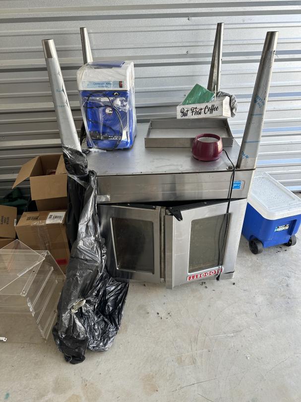 This unit appears to contain…Outside Access, Blodgett industrial oven, rolling shelves, sno-cone maker, fans, boxes, totes, credit card machine, Olde Midway hot dog roller, flat screen TV, kitchenware
