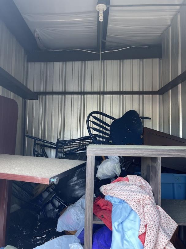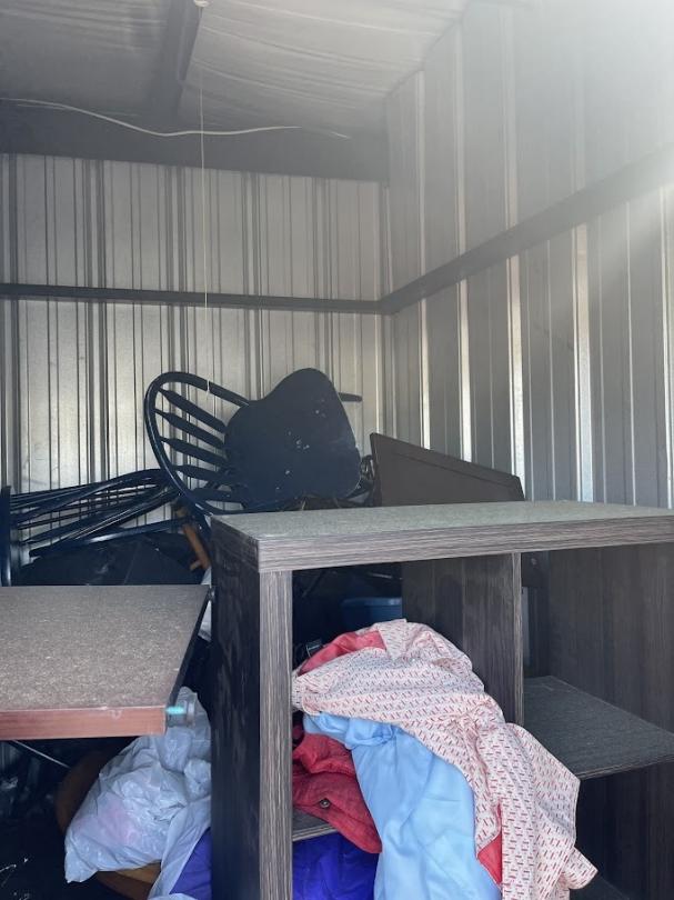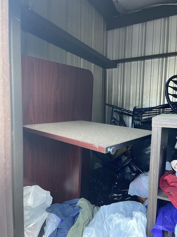 This unit appears to contain…Unit contains: clothes, table, chairs, bags, shelf, shoes