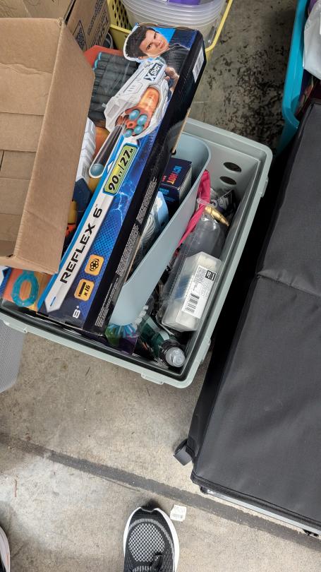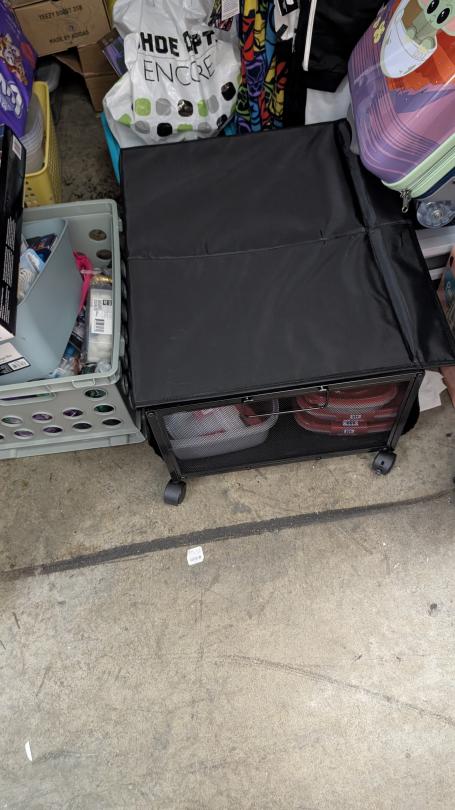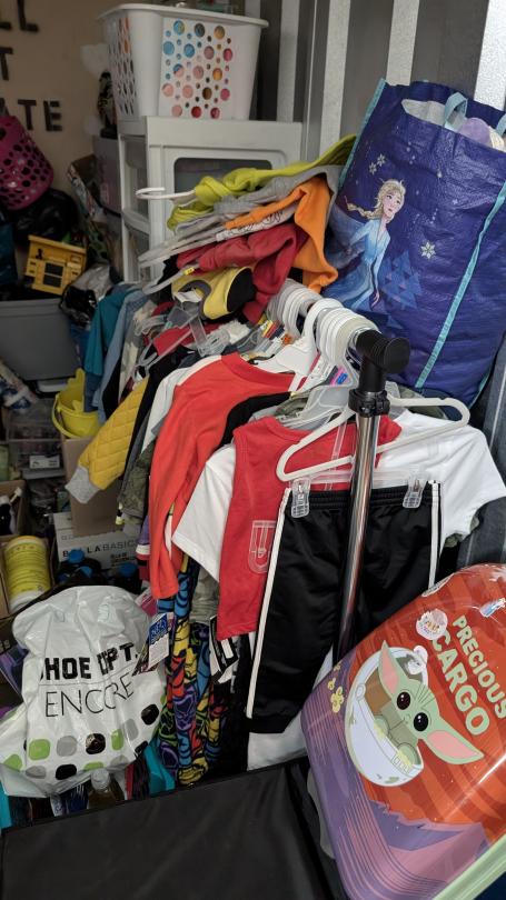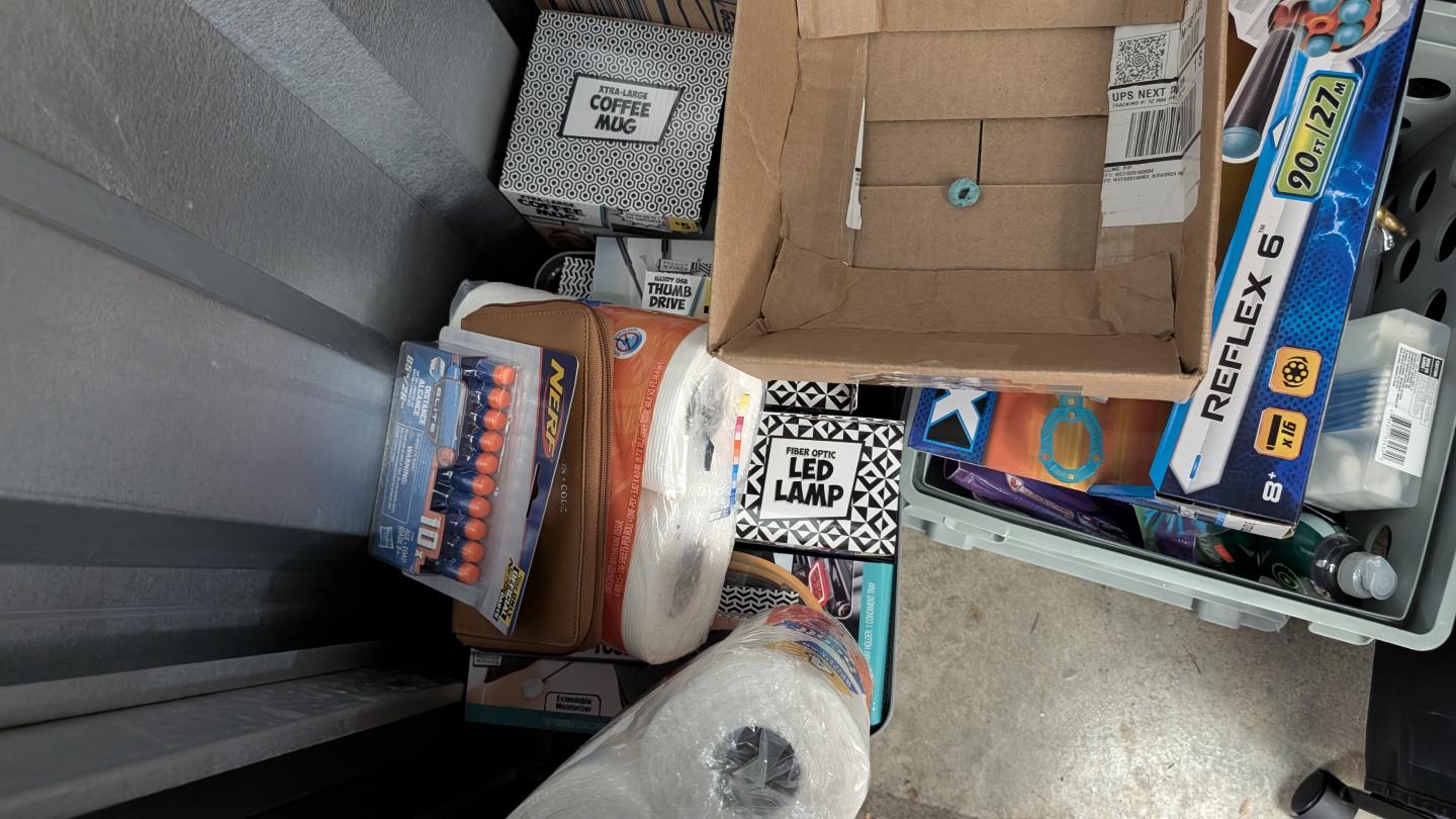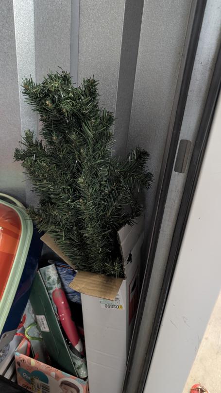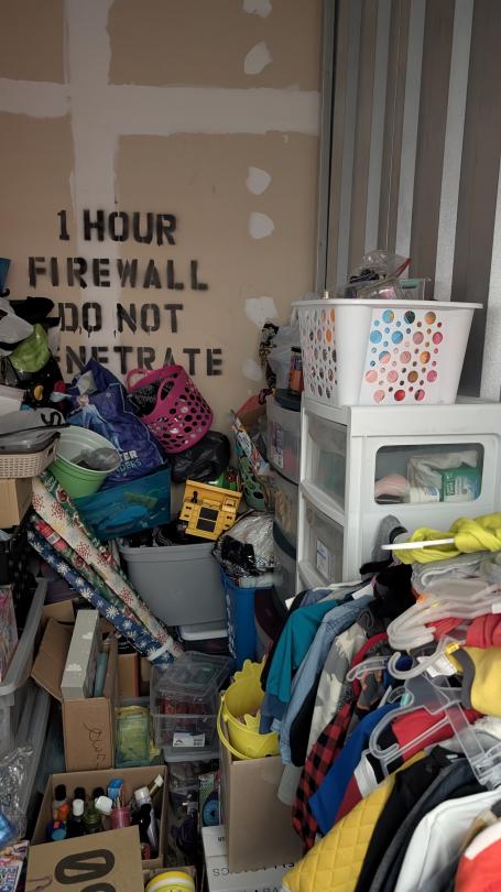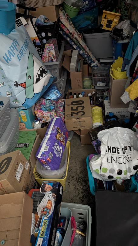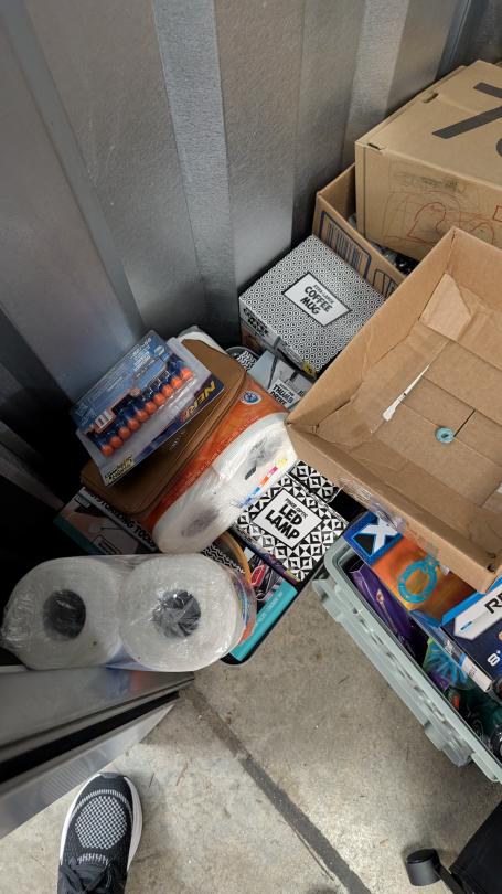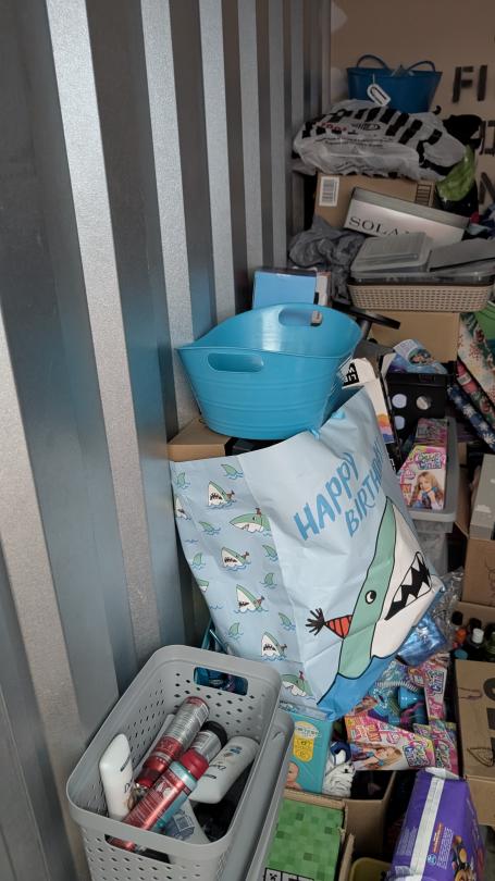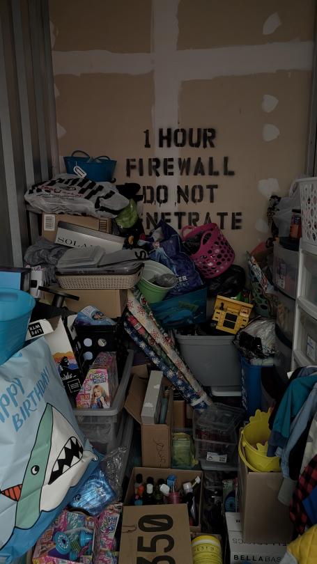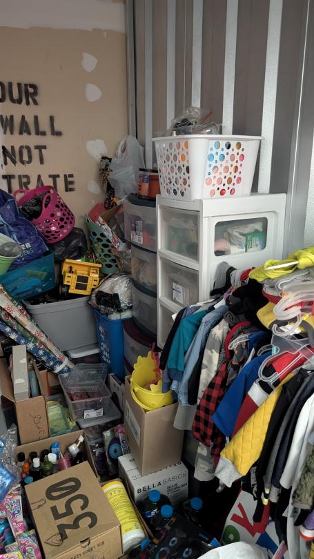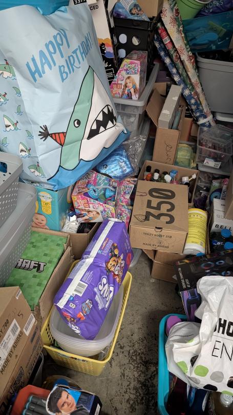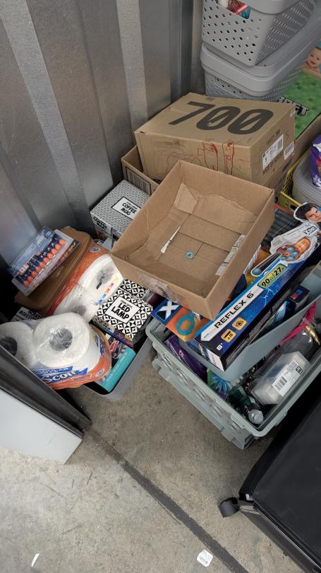 This unit appears to contain…BOXES, CLEANING SUPPLIES, KIDS SUIT CASE, CLOTHES, BAGS, SMALL CHRISTMAS TREE, TOYS, BASKETS, PLASTIC DRAWERS, ETC