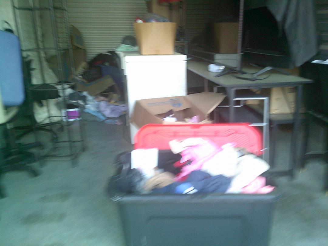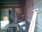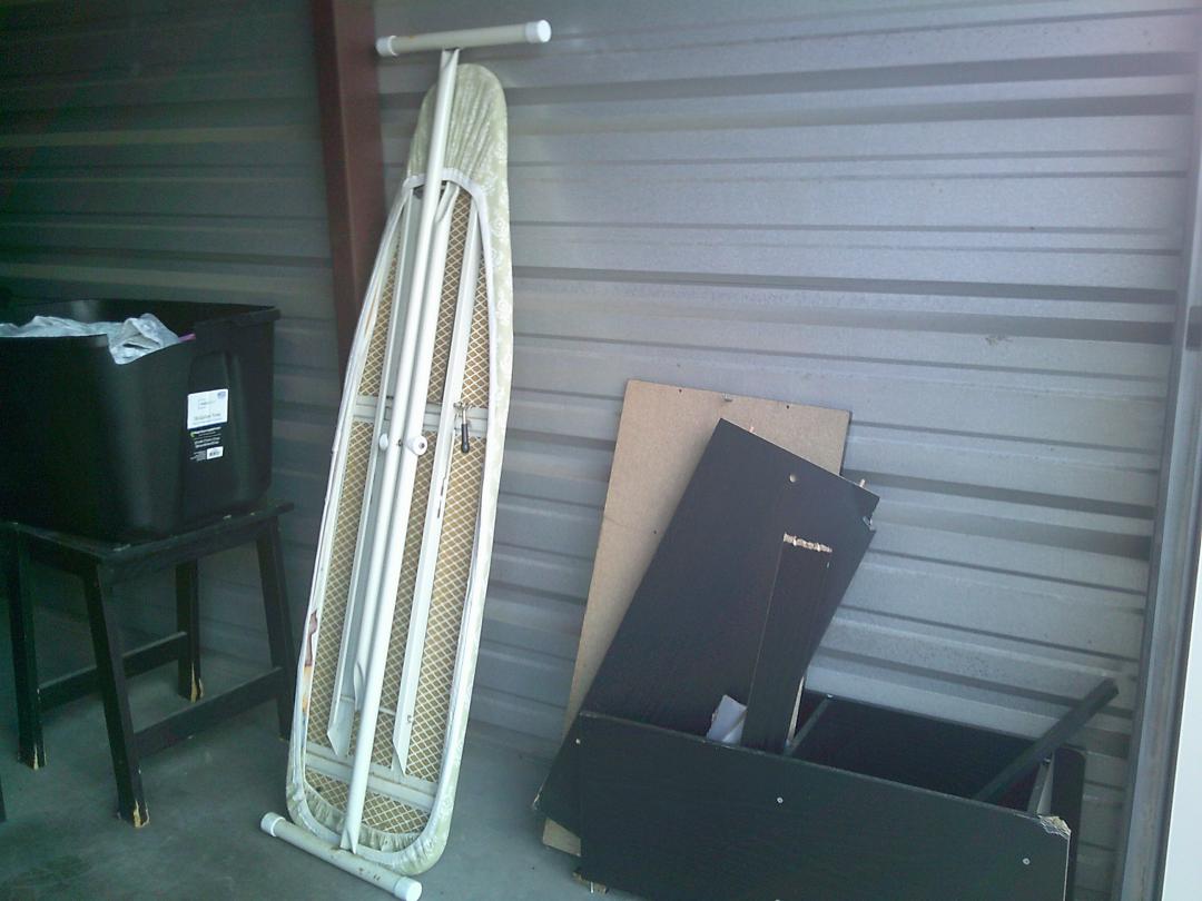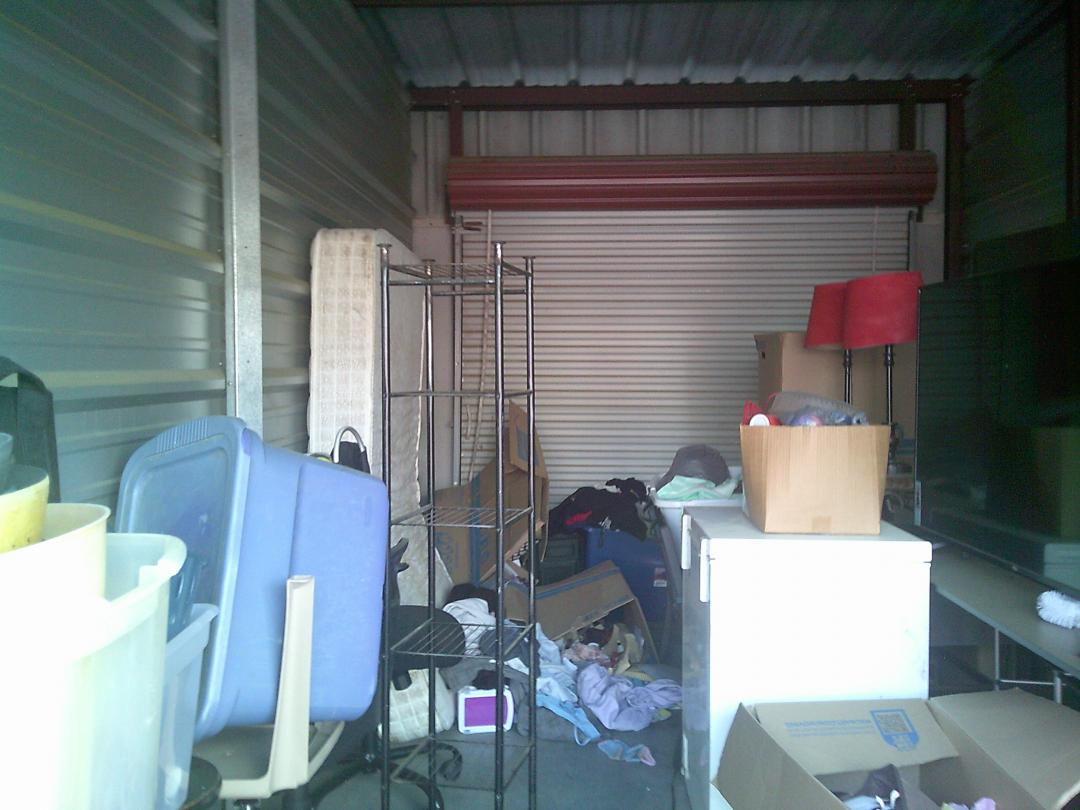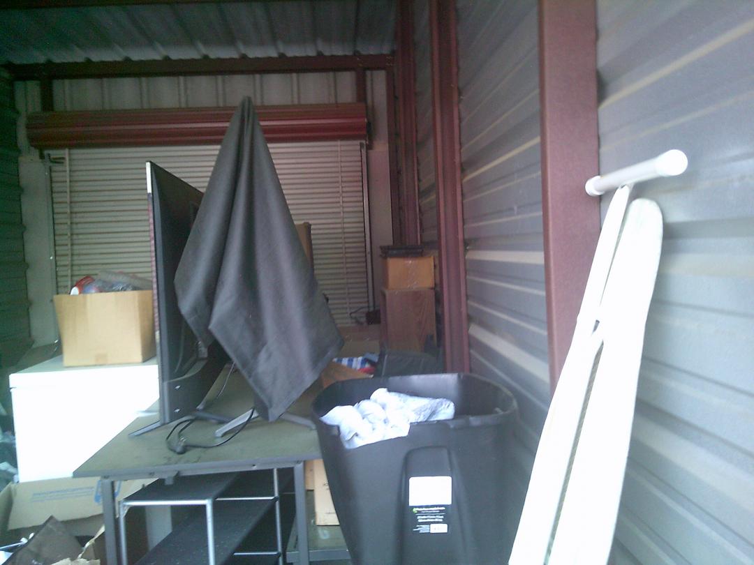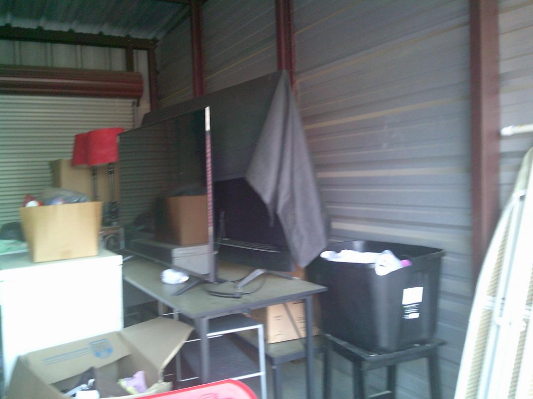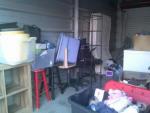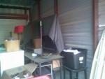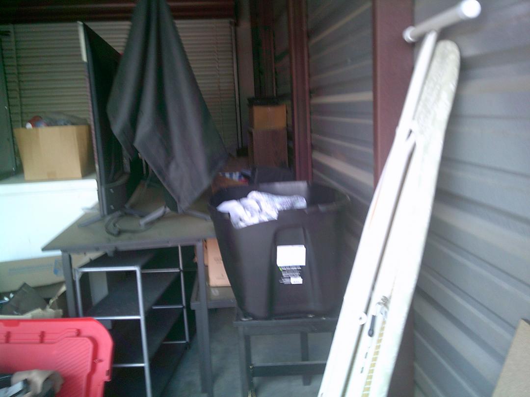 This unit appears to contain…BOXES, IRON BOARD, TOTES, SHELVES, TABLES, 2 FLAT SCREEN TVS, MATTRESS, LAMPS, STOOLS, WIRE SHELF, SMALL DROP FREEZER, COMPUTER CHAIRS, ETC
