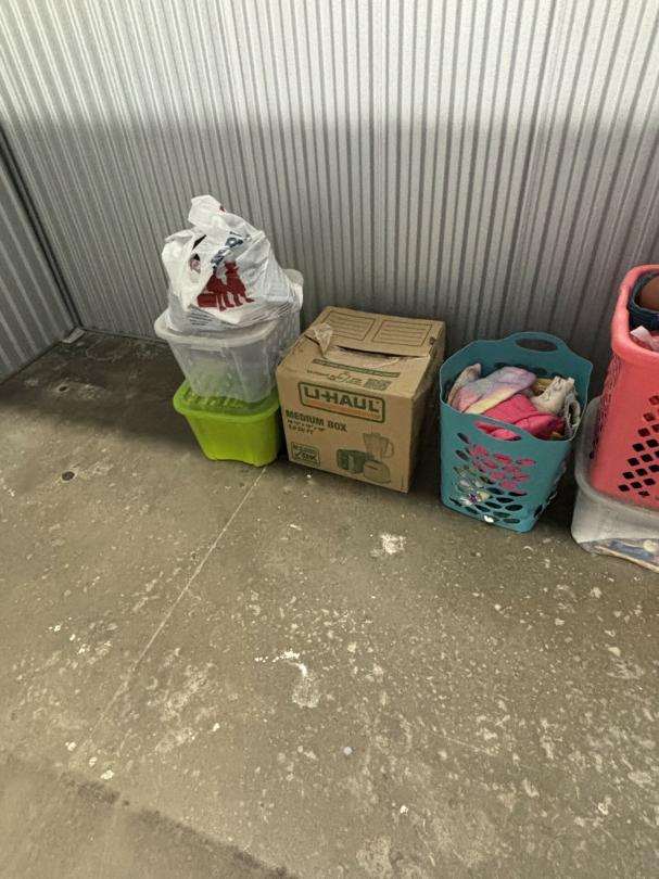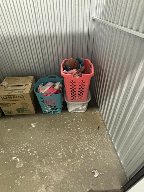 This unit appears to contain…Misc. Boxes,Clothing,Misc. Items,Laundry Baskets