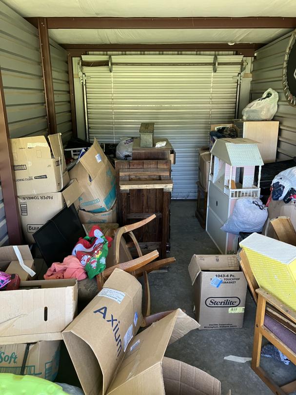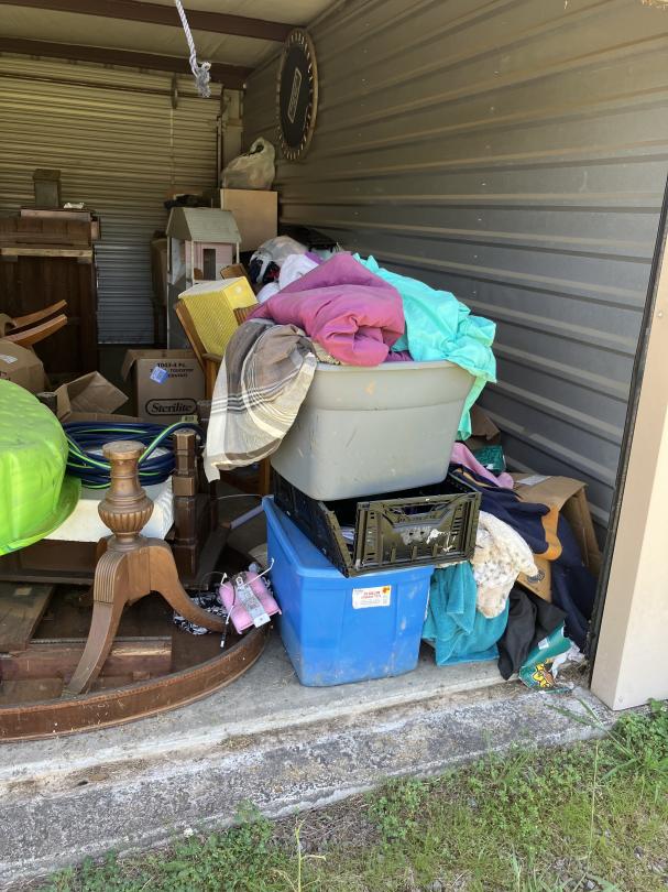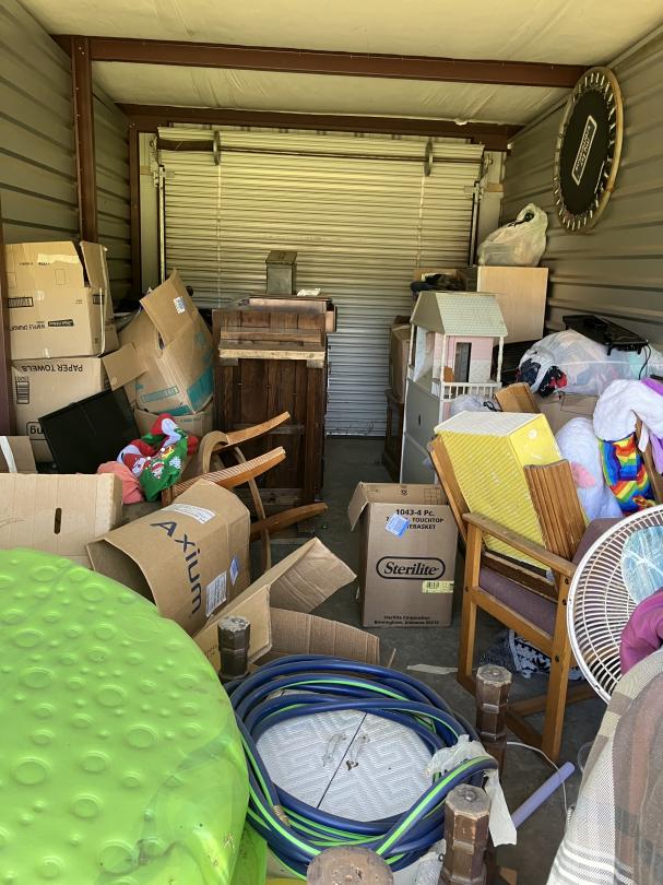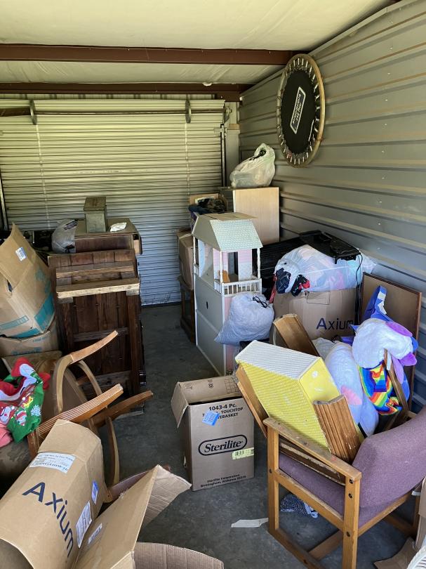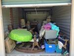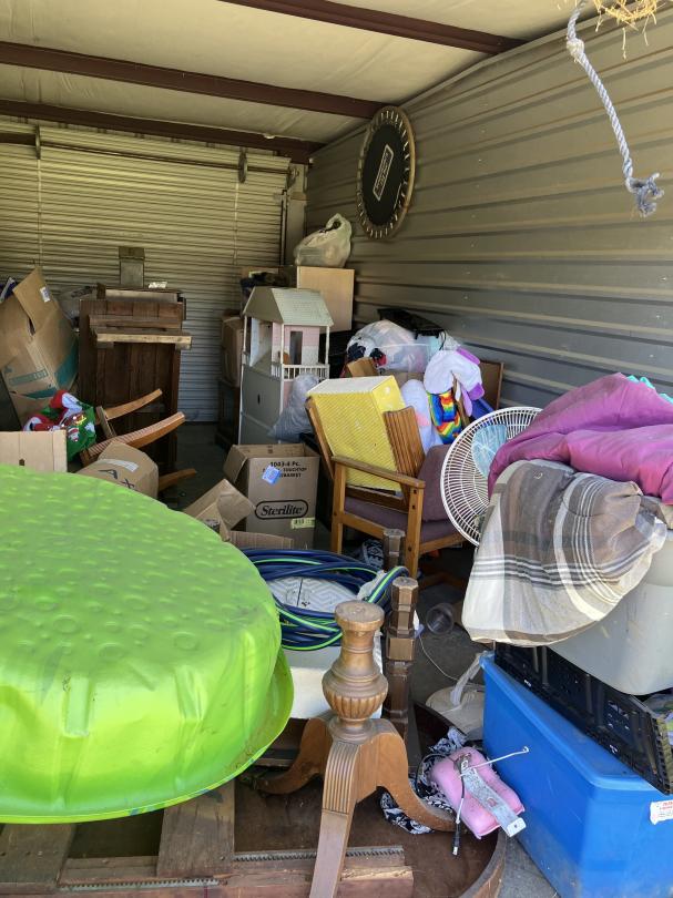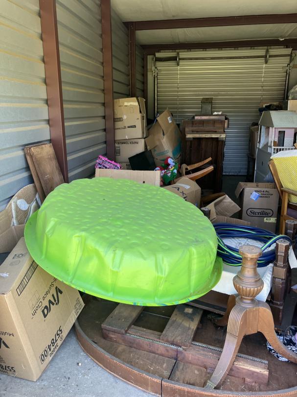 This unit appears to contain…Kids plastic pool, table, boxes, doll house, small trampoline, clothes, Chairs