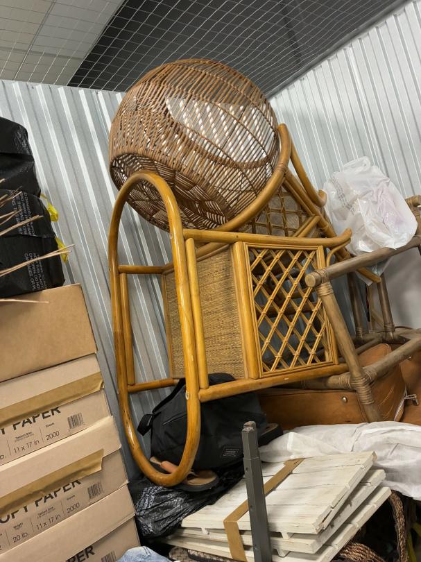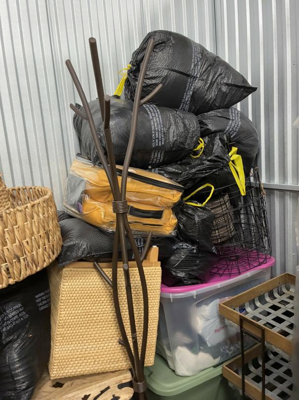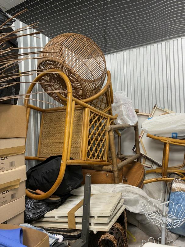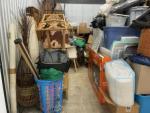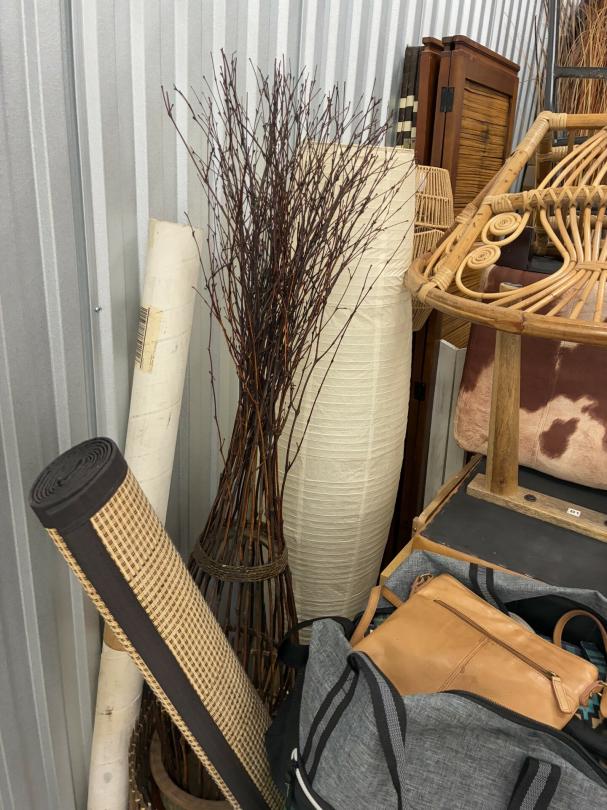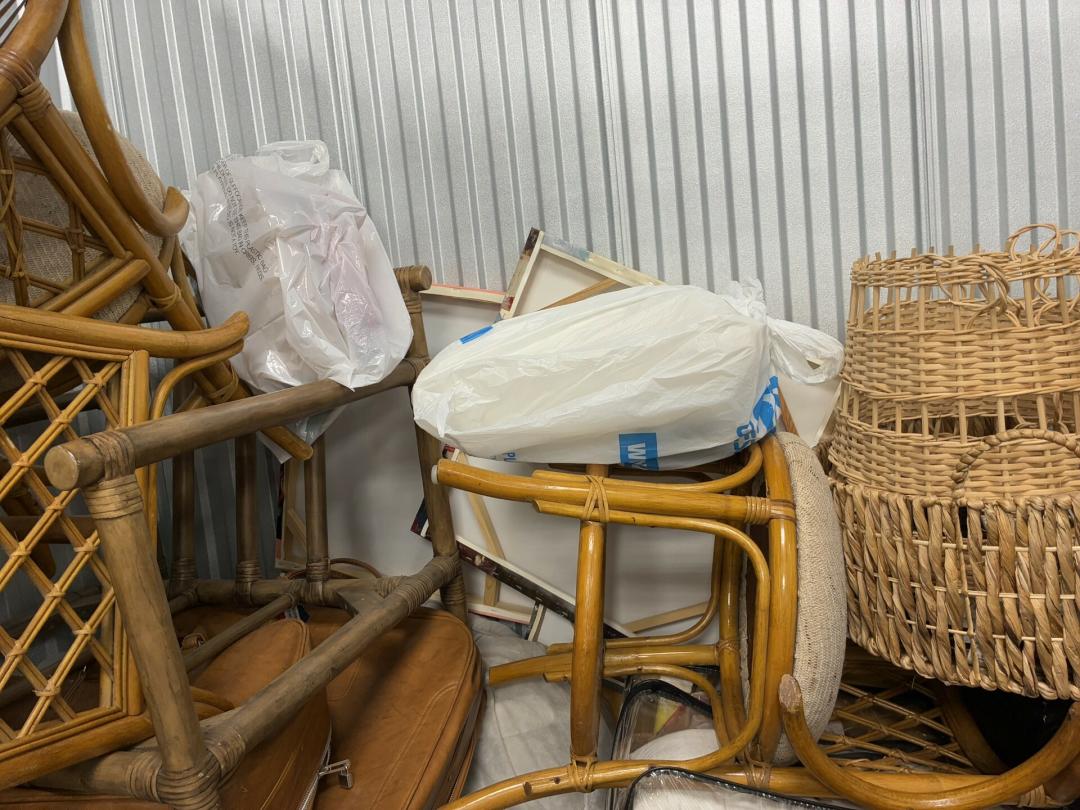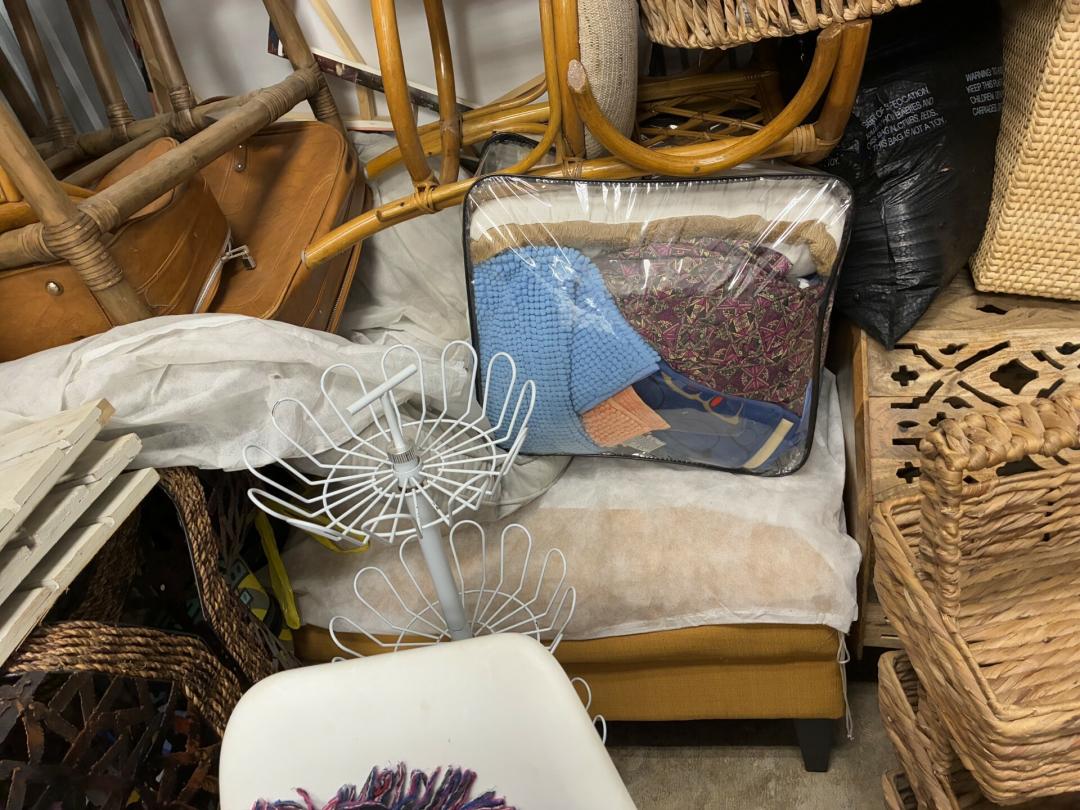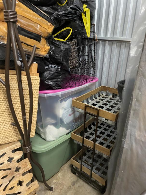 This unit appears to contain…Wicker Furniture, washer-dryer, tv-tv stand, couch, chairs, room divider, pictures, bamboo decor, rugs, purses, 2 audubon's, mattress-frame-head & foot board, planter, bedding, shoes, clothes, coats, leaf blower & bags of misc. items
