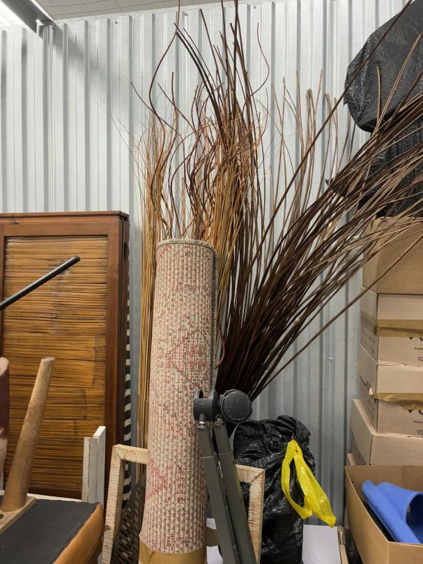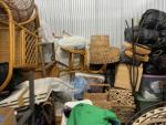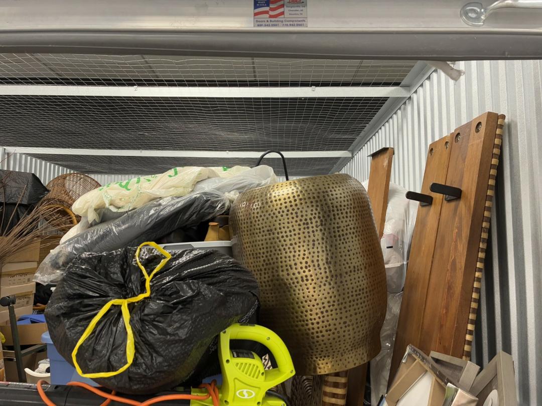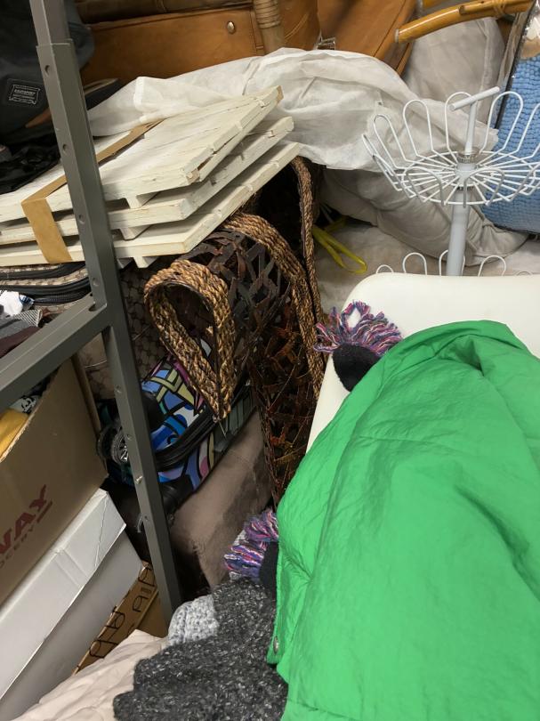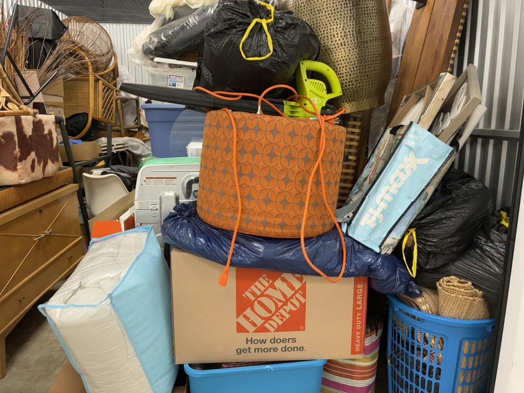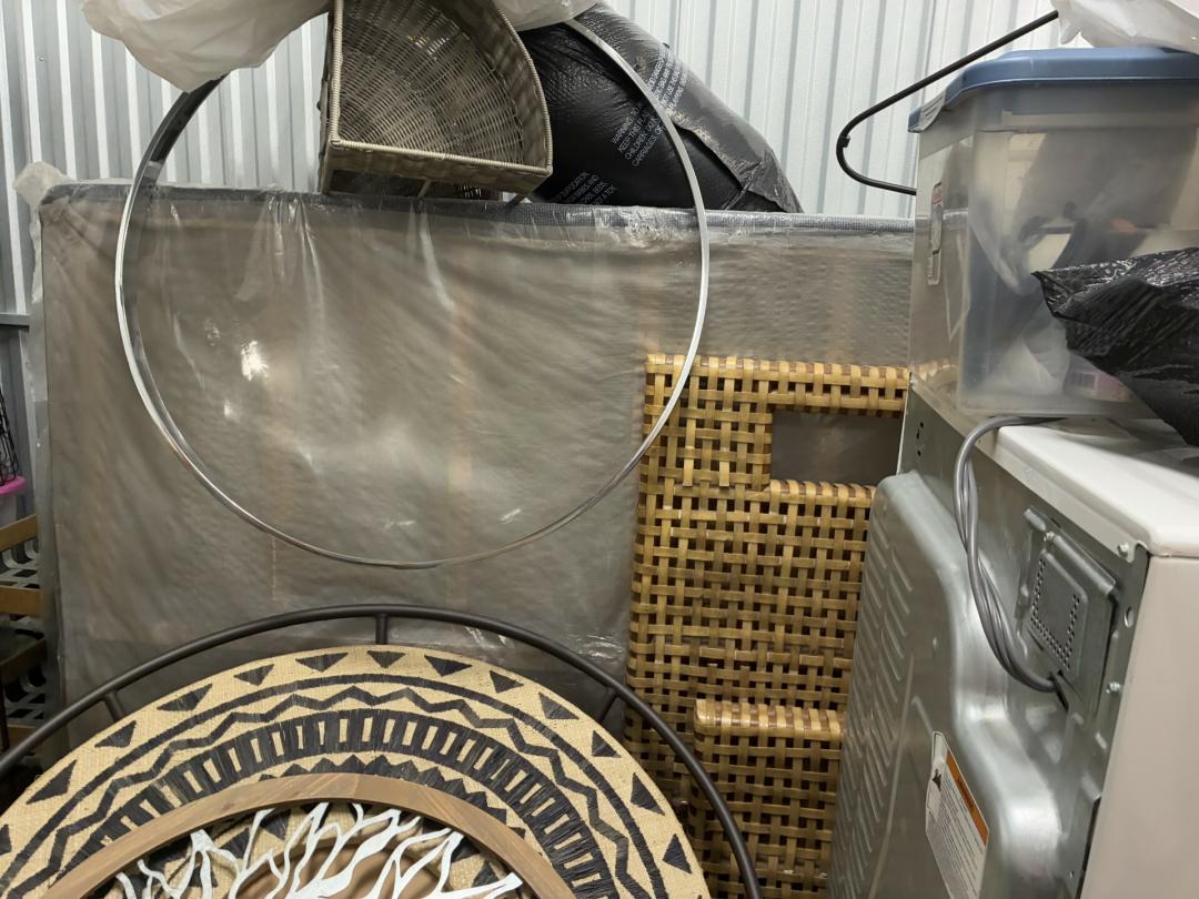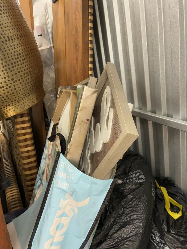 This unit appears to contain…Wicker Furniture, washer-dryer, tv-tv stand, couch, chairs, room divider, pictures, bamboo decor, rugs, purses, 2 audubon's, mattress-frame-head & foot board, planter, bedding, shoes, clothes, coats, leaf blower & bags of misc. items