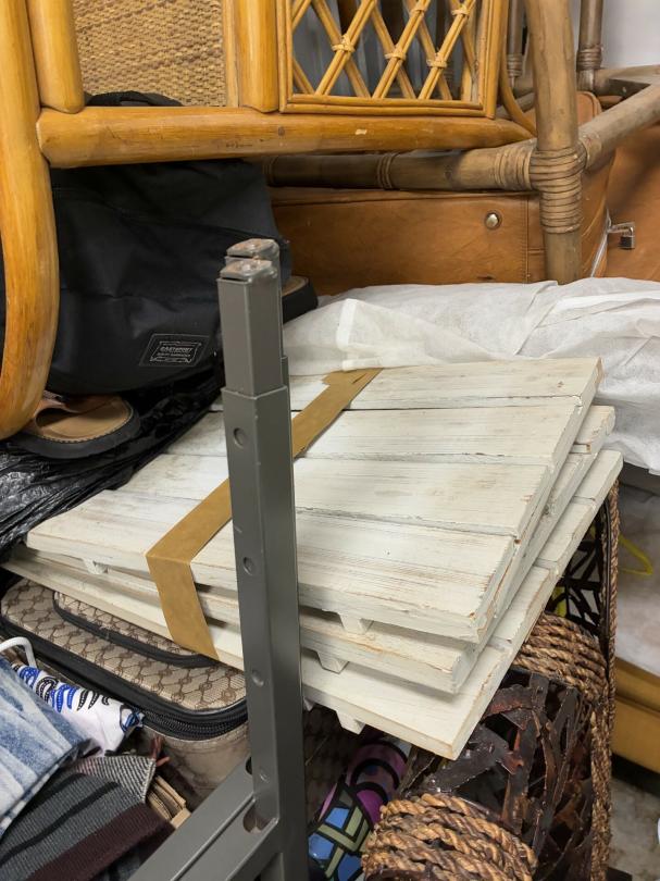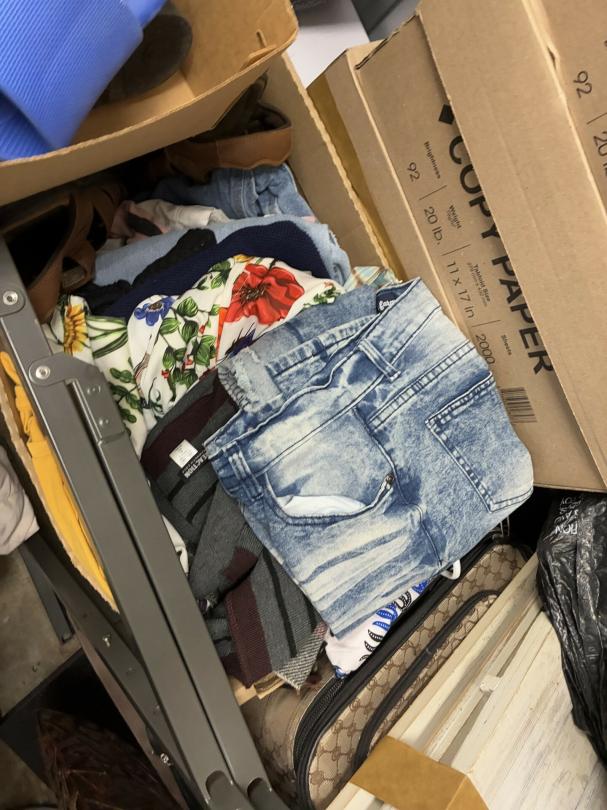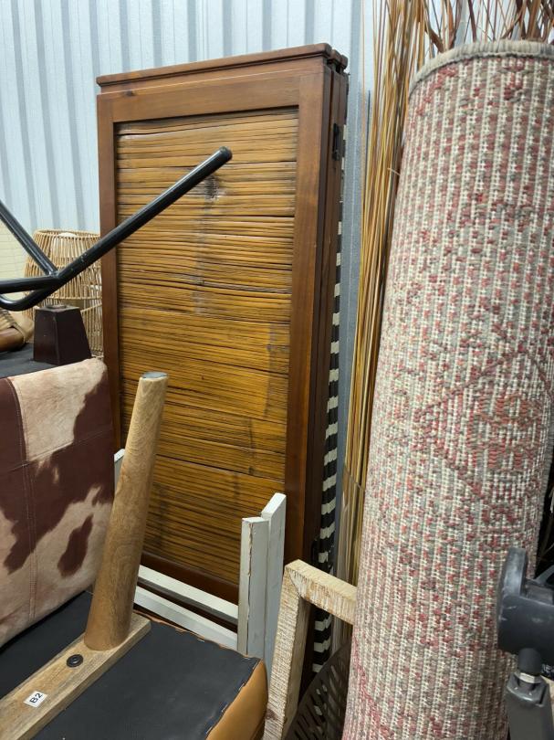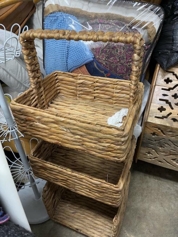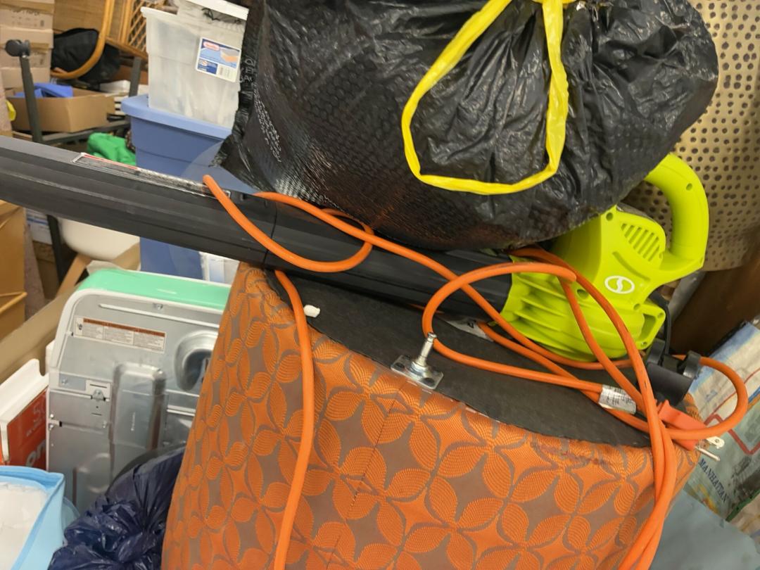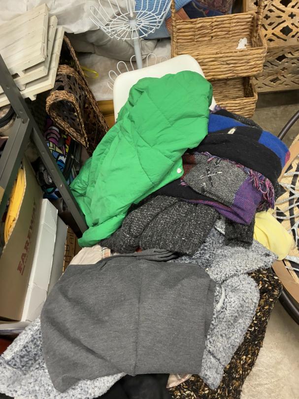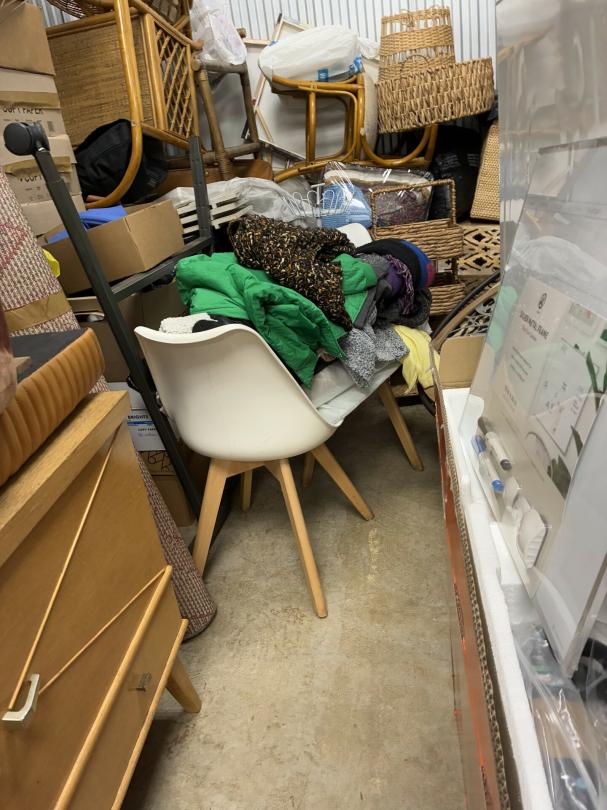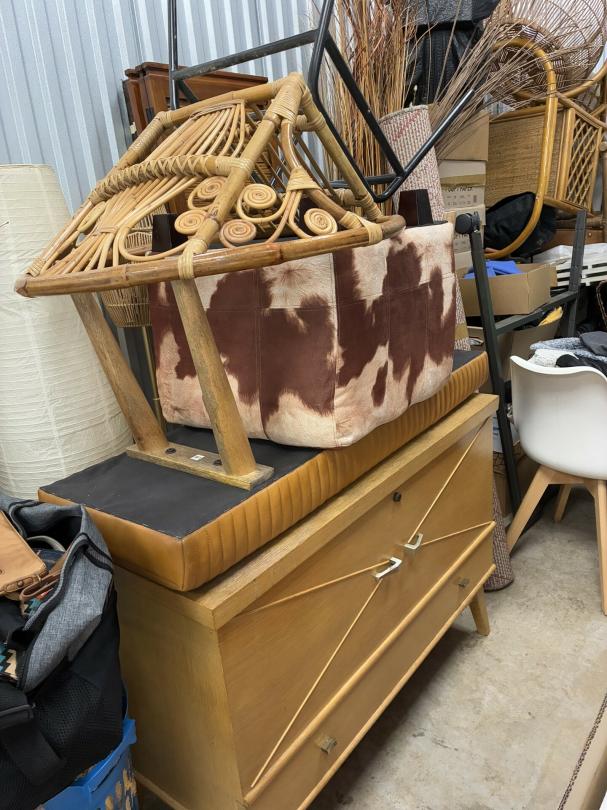 This unit appears to contain…Wicker Furniture, washer-dryer, tv-tv stand, couch, chairs, room divider, pictures, bamboo decor, rugs, purses, 2 audubon's, mattress-frame-head & foot board, planter, bedding, shoes, clothes, coats, leaf blower & bags of misc. items