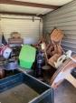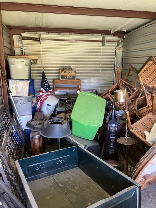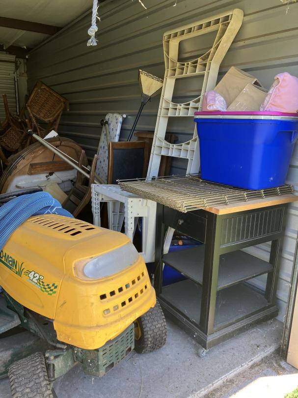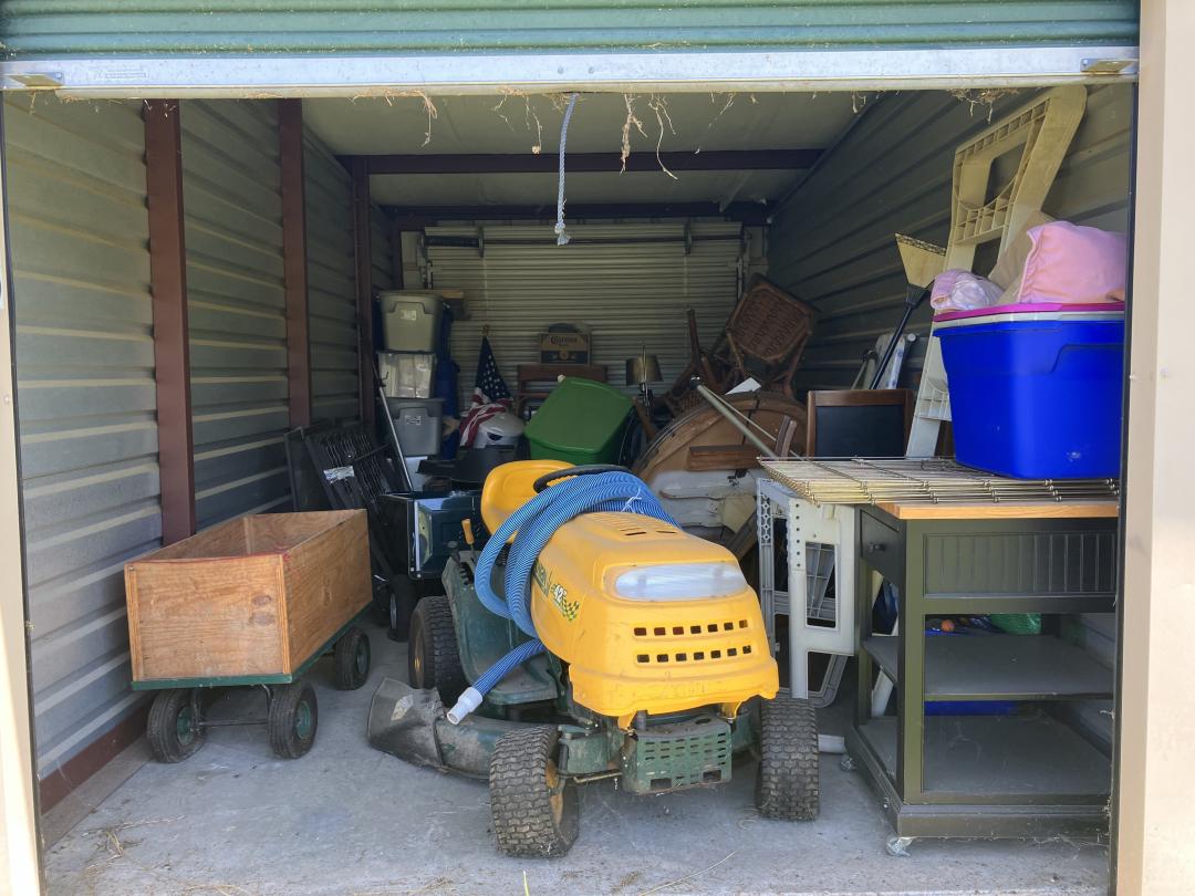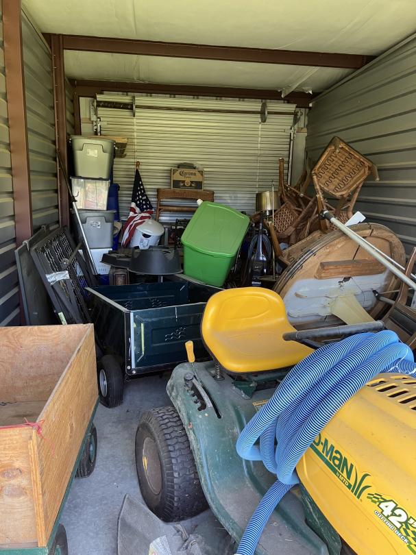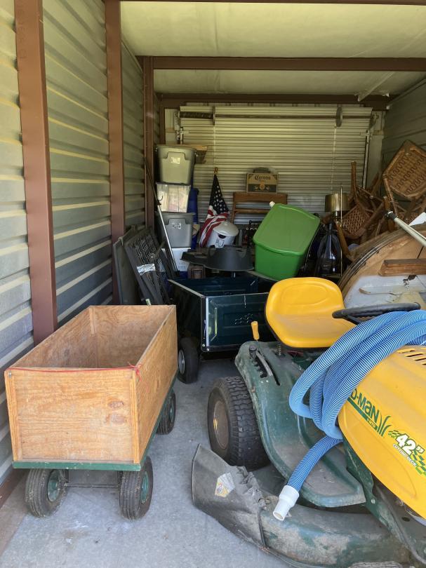 This unit appears to contain…Riding Lawn Mower with trailer, Totes, Whickered chairs, Vacuum, lamp, Boxes, Laundry basket,