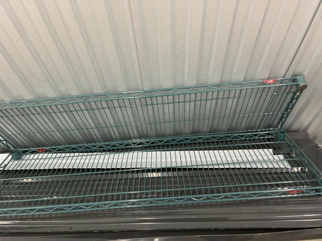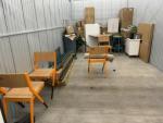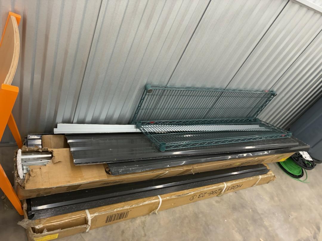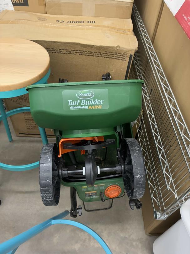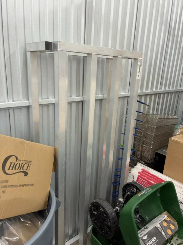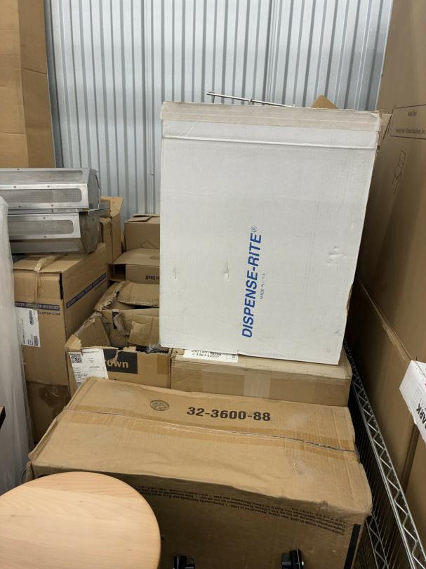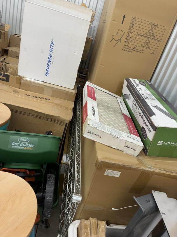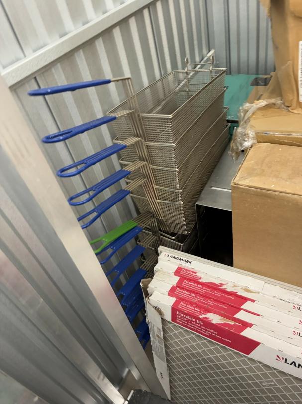 This unit appears to contain…Restaurant items, kitchenware, shelving, table, chairs, bar stools, filters, racks, cup dispenser, porcelain tiles 2 Scott seed spreaders, fryer buckets, rolling been, & wire