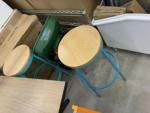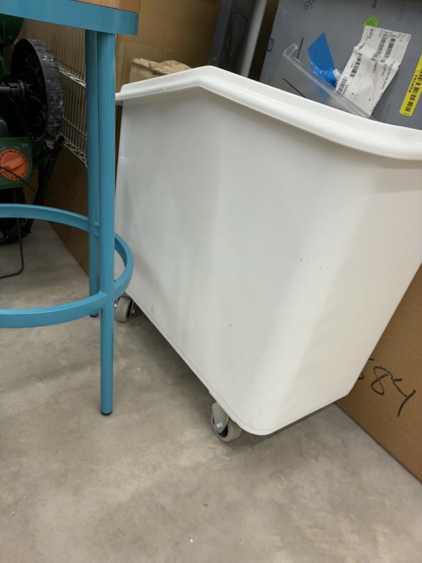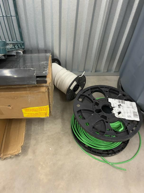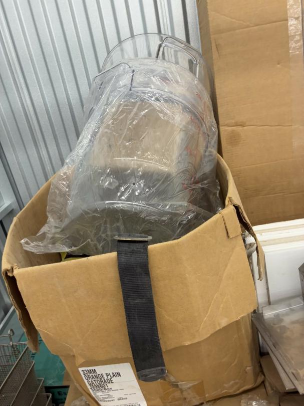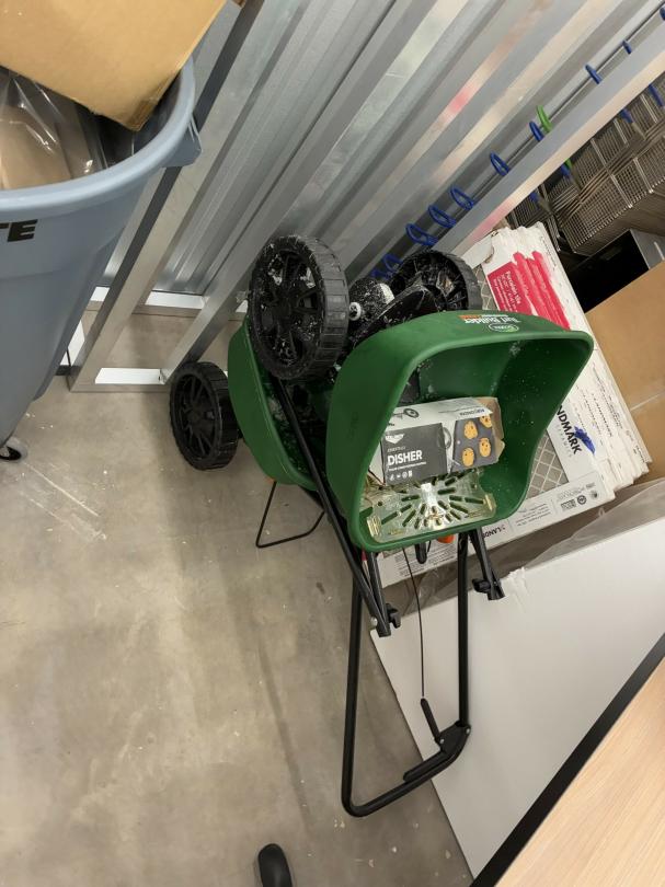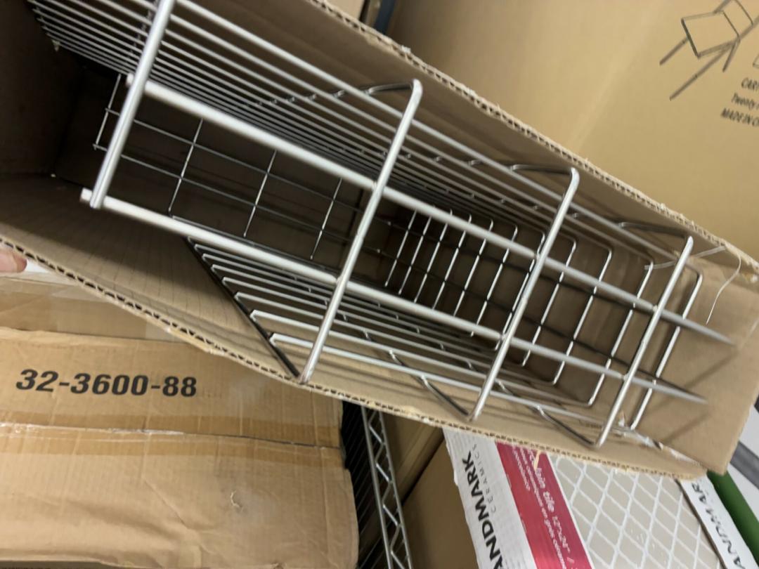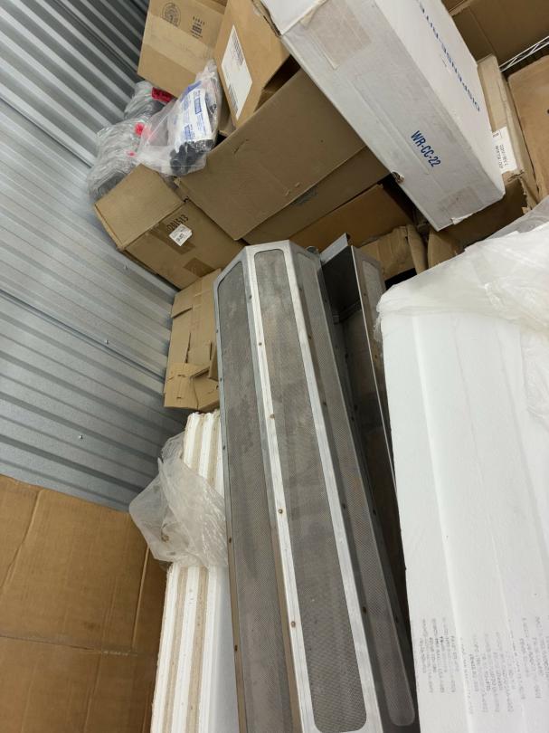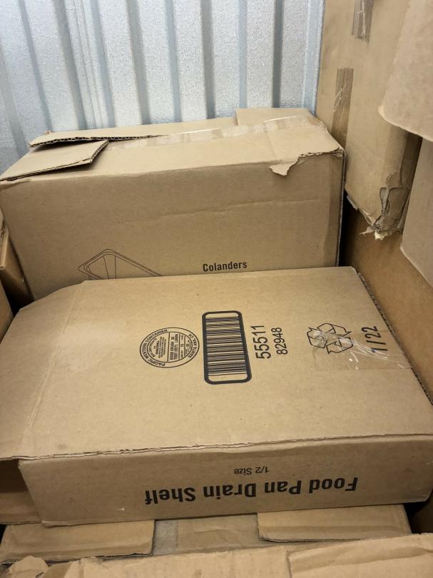 This unit appears to contain…Restaurant items, kitchenware, shelving, table, chairs, bar stools, filters, racks, cup dispenser, porcelain tiles 2 Scott seed spreaders, fryer buckets, rolling been, & wire