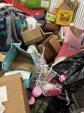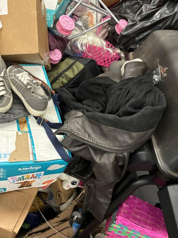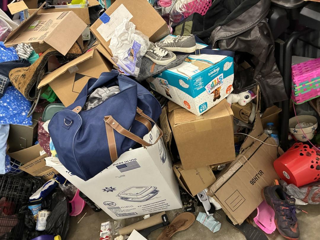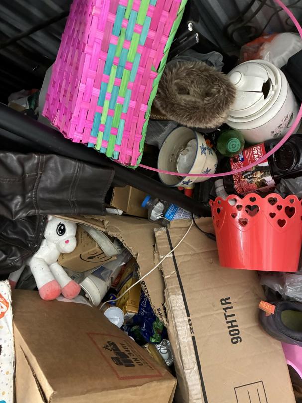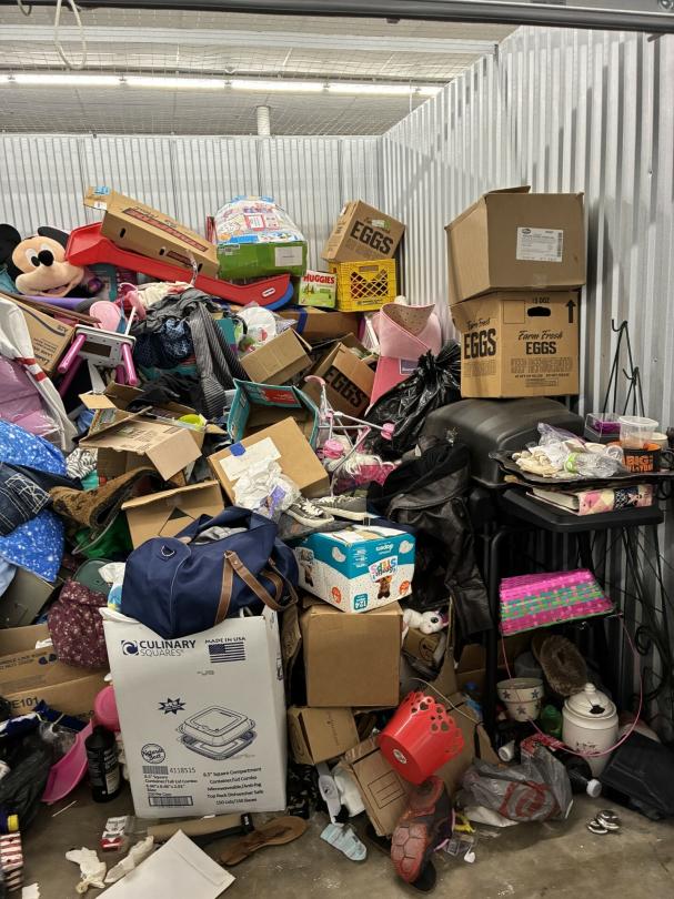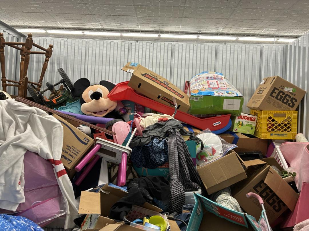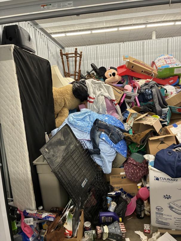 This unit appears to contain…mattress, grill, bedding, clothes, coat, shoes, kennel, chairs, purses, stuffed animals kids' toys, trike, chair, activities-crafts Boxes & Bags of Misc. household items