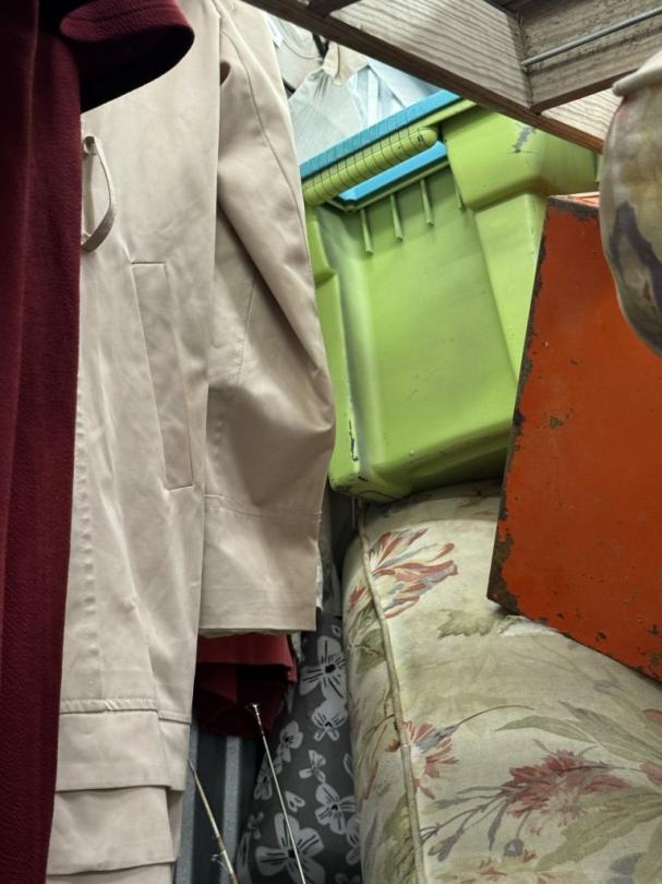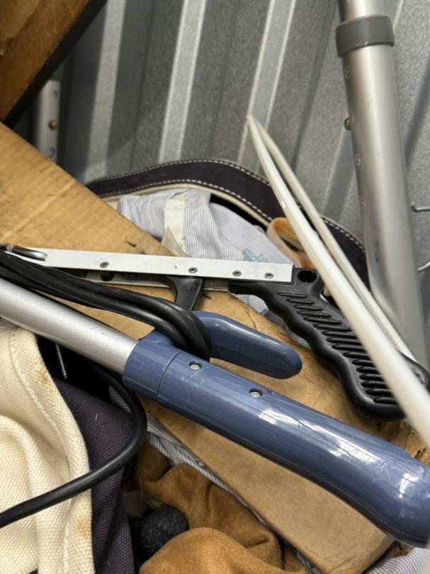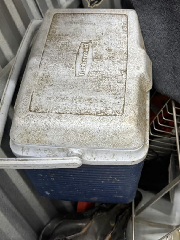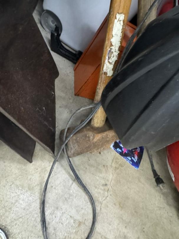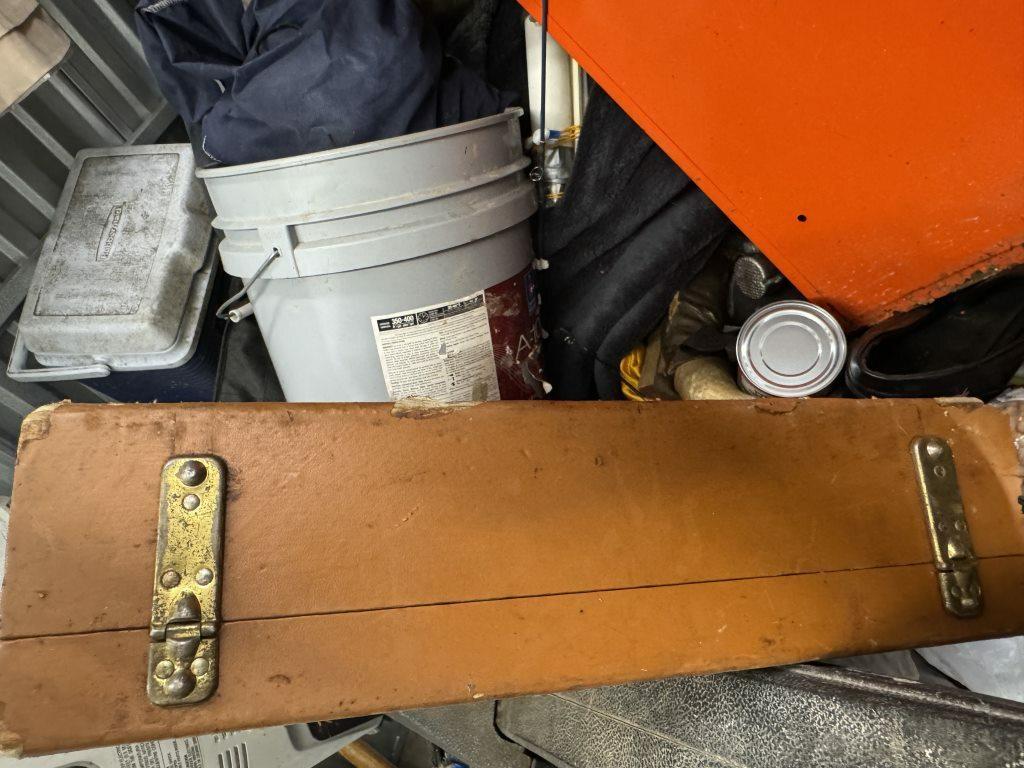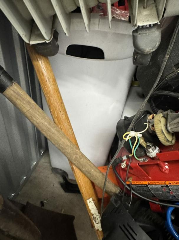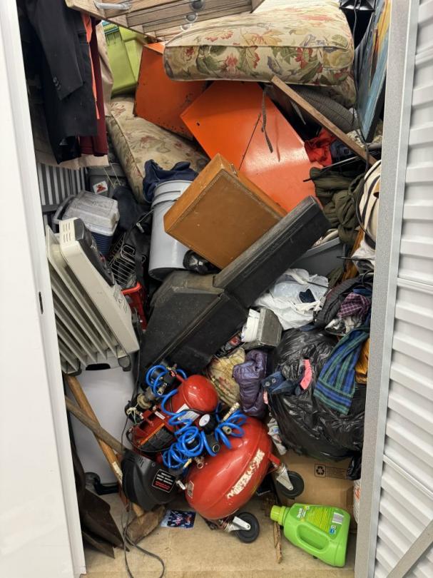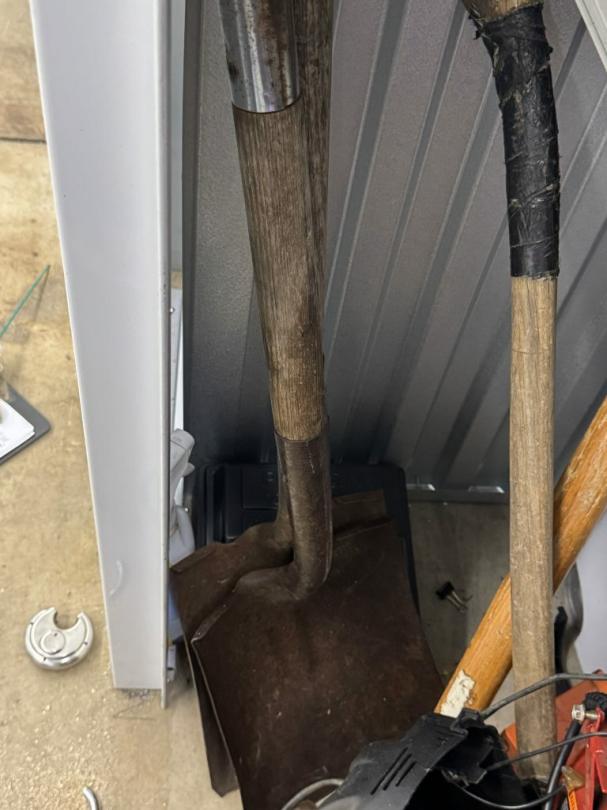 This unit appears to contain…air compressor-pump, clothes shovel, hammer, sledgehammer, fishing pool, cooler, file cabinet