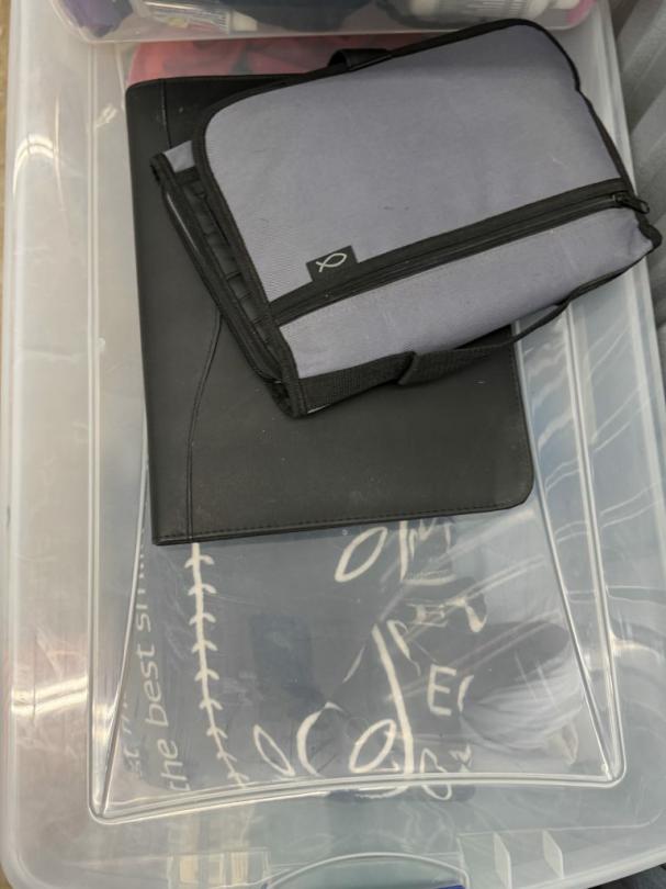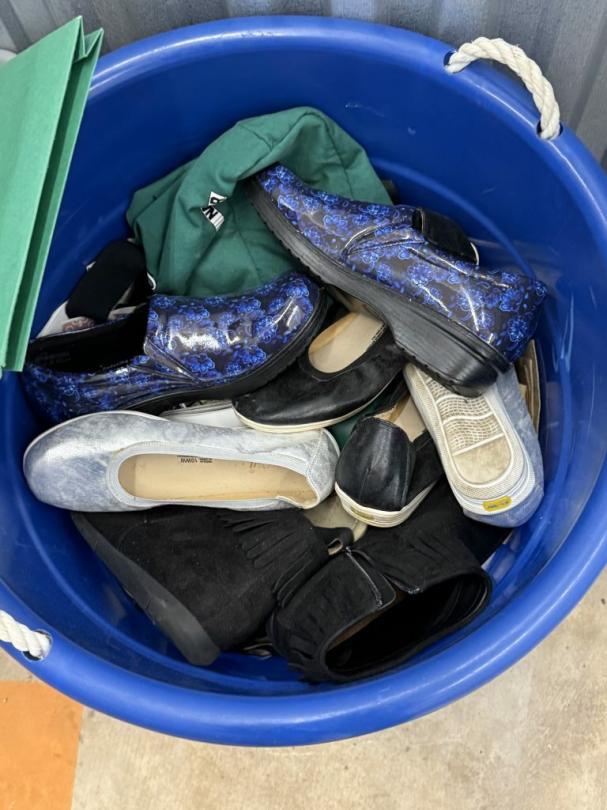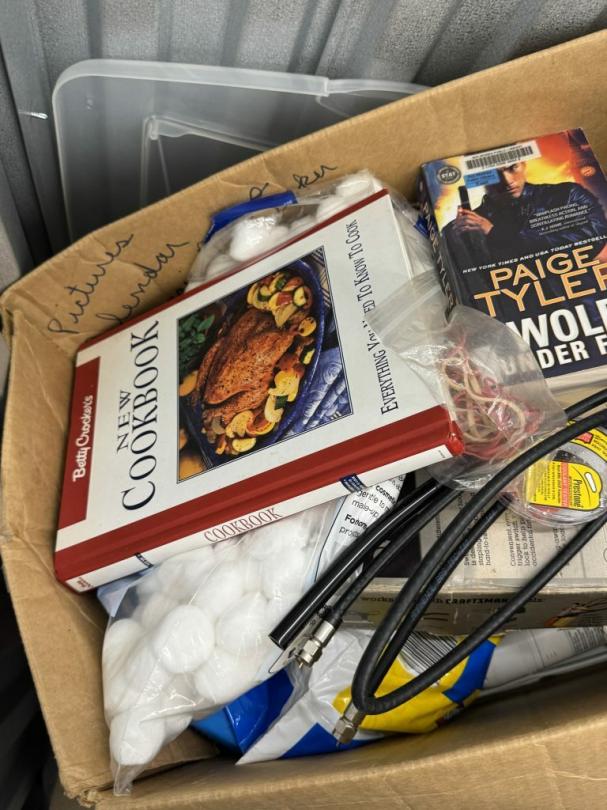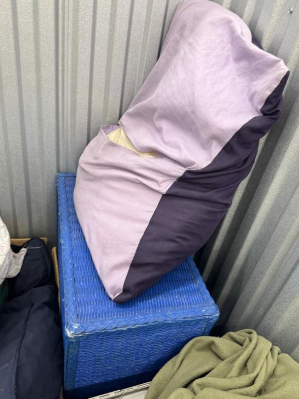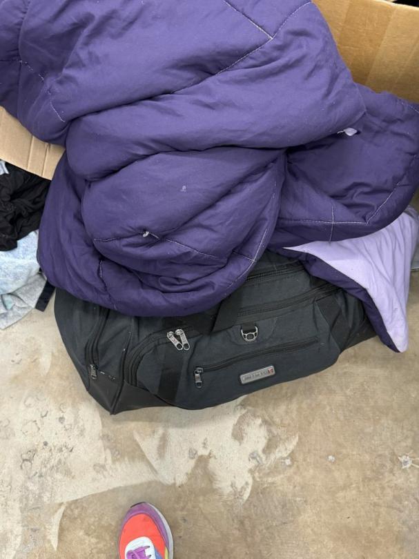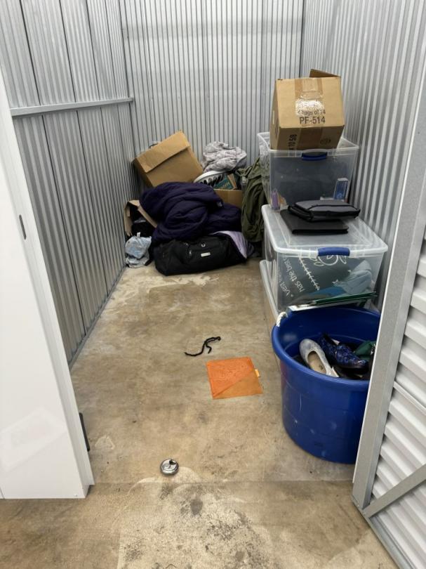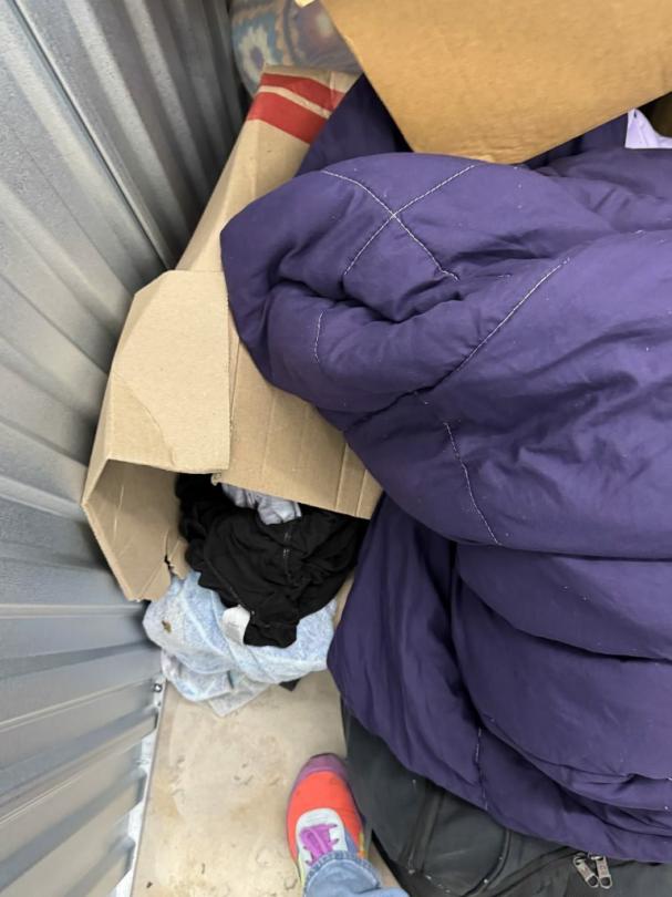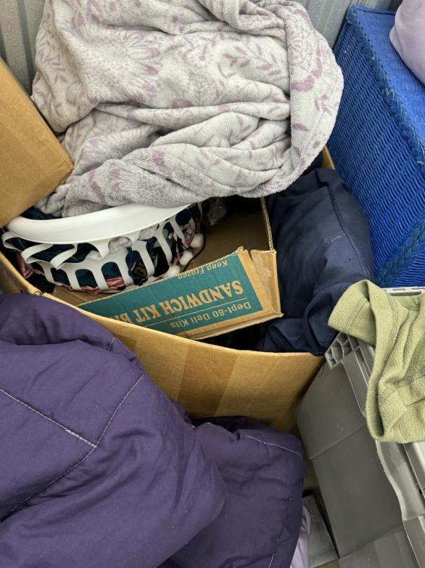 This unit appears to contain…blankets, basket w/clothes, shoes, books, duffel bag, pillow, boxes & bins of misc, items