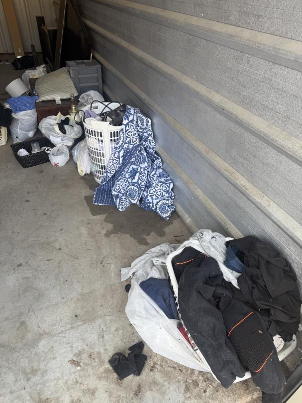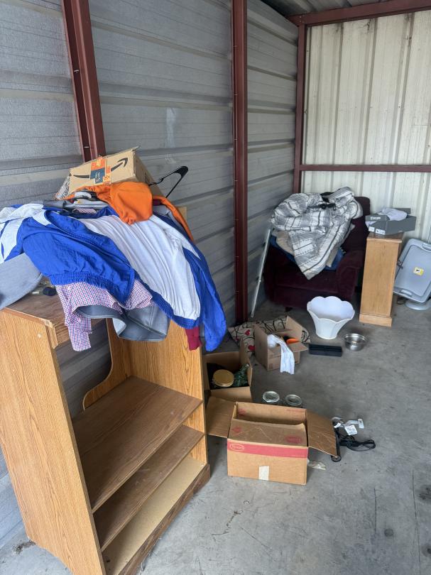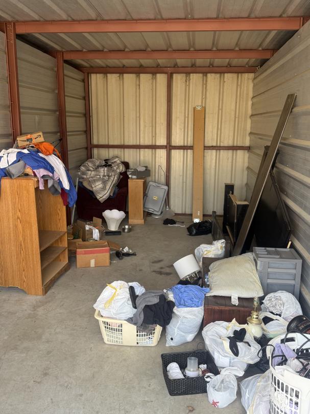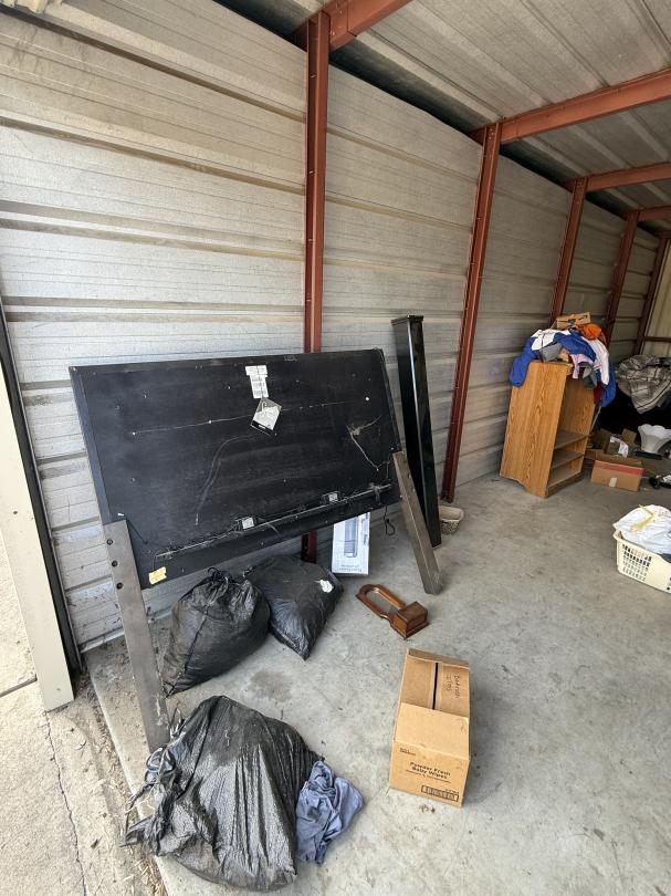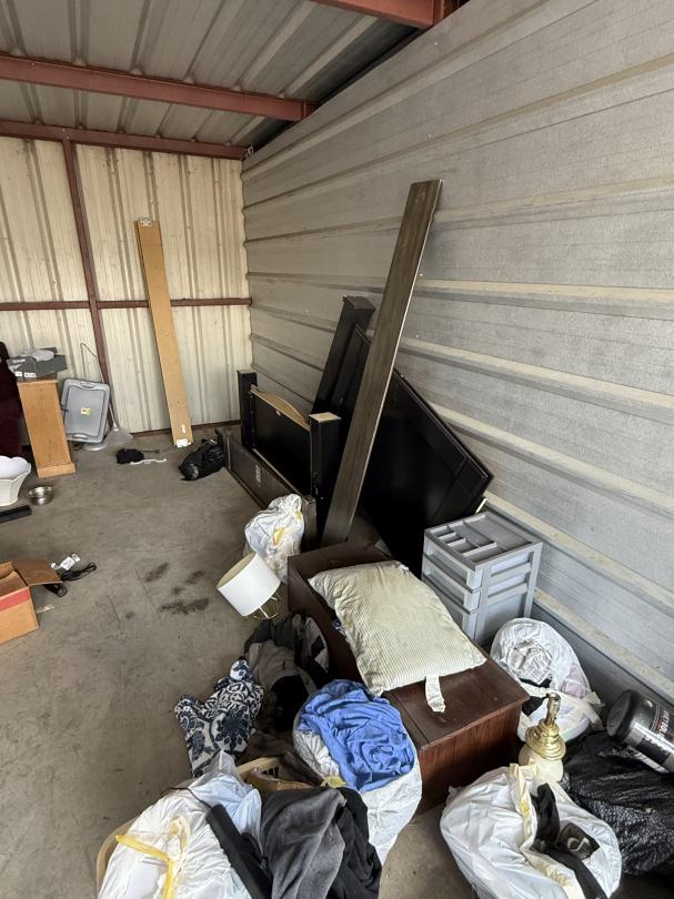 This unit appears to contain…Bedframe, bookshelf, arm chair, TV Cabinet, chest, lamps, bedding, clothes and household misc.