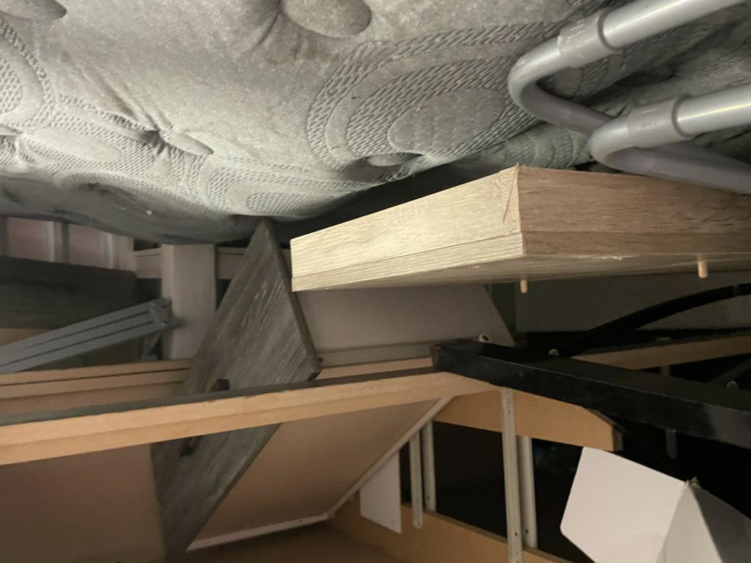 This unit appears to contain…hand vacuum, queen mattress w/wooden frame, dresser, electric fireplace desk, boots, shoes, pet carrier, misc. items