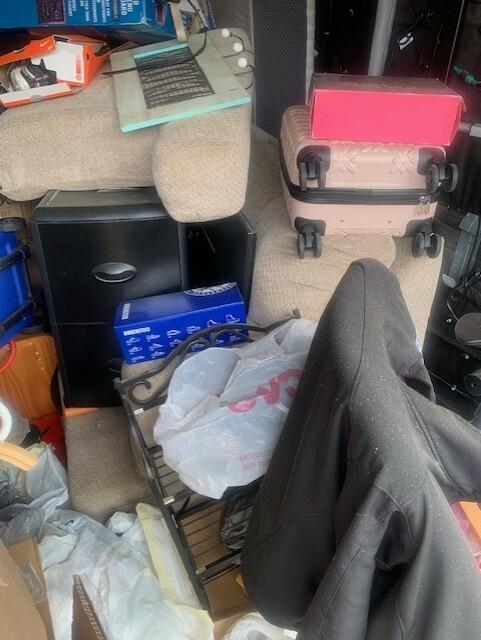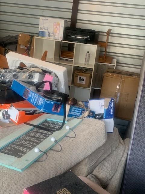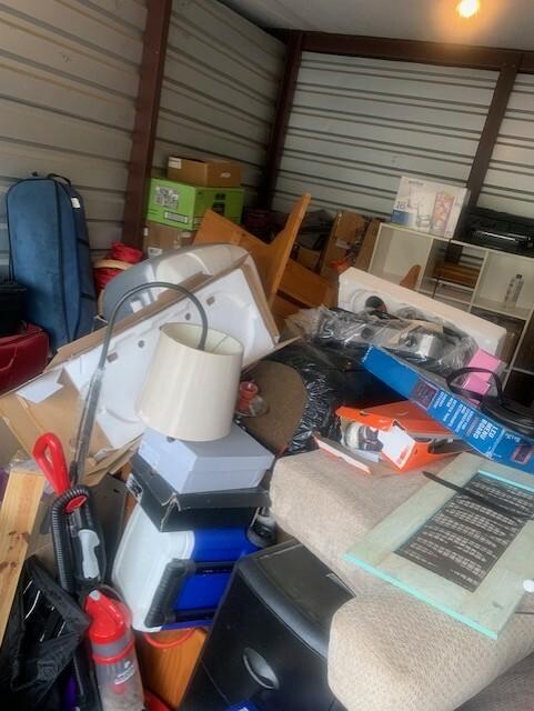 This unit appears to contain…sofa, mattress, bed frame, file cabinet, vacuum, coolers, office chair, suitcases, clothes, boxes, bags, wicker basket, lamp, printer, book shelf