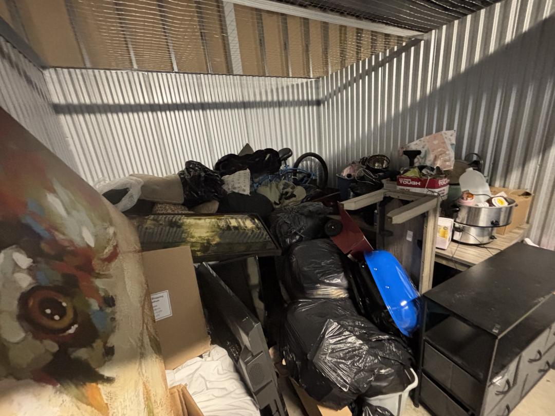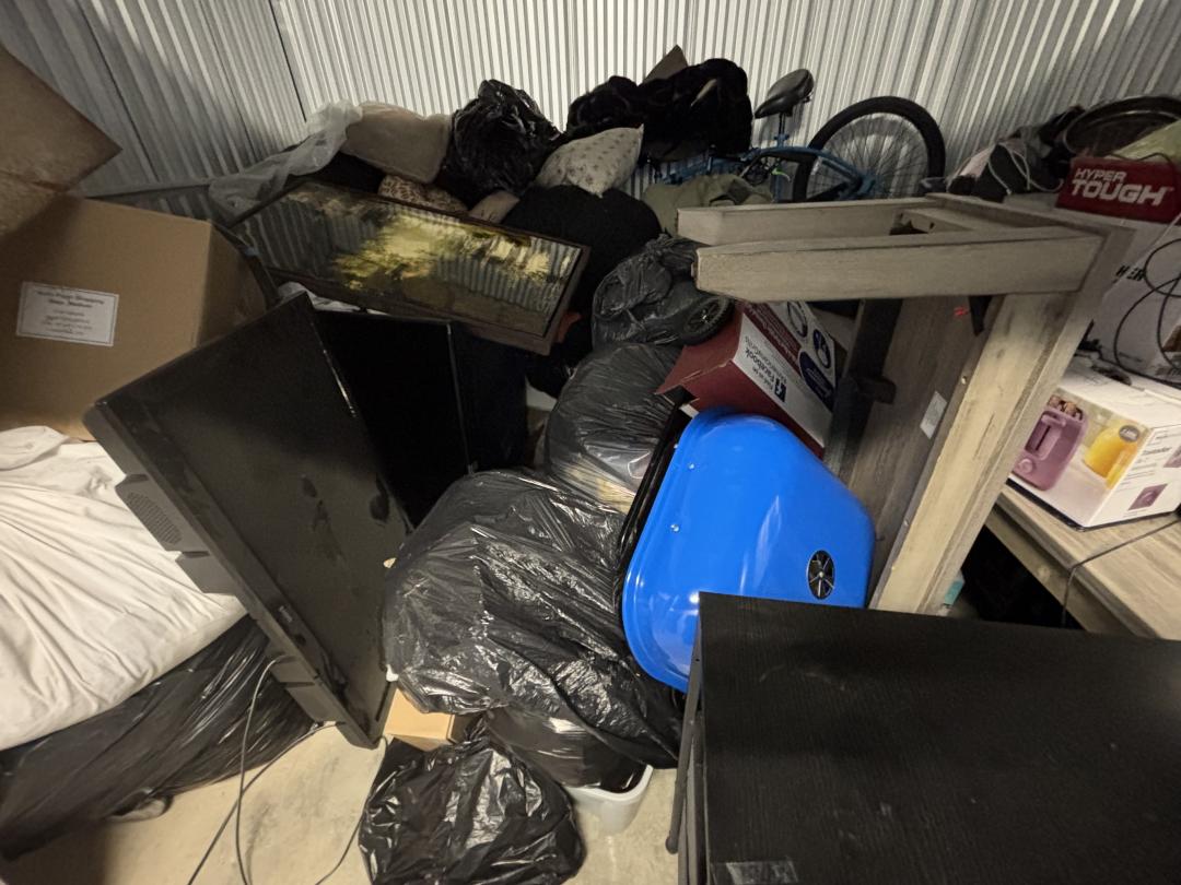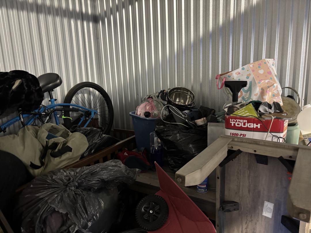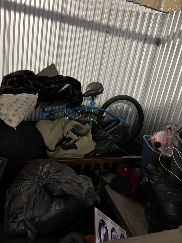 This unit appears to contain…This unit contains clothes, a bike, kitchenware, a table, and more.