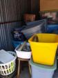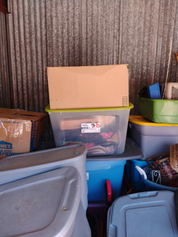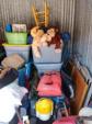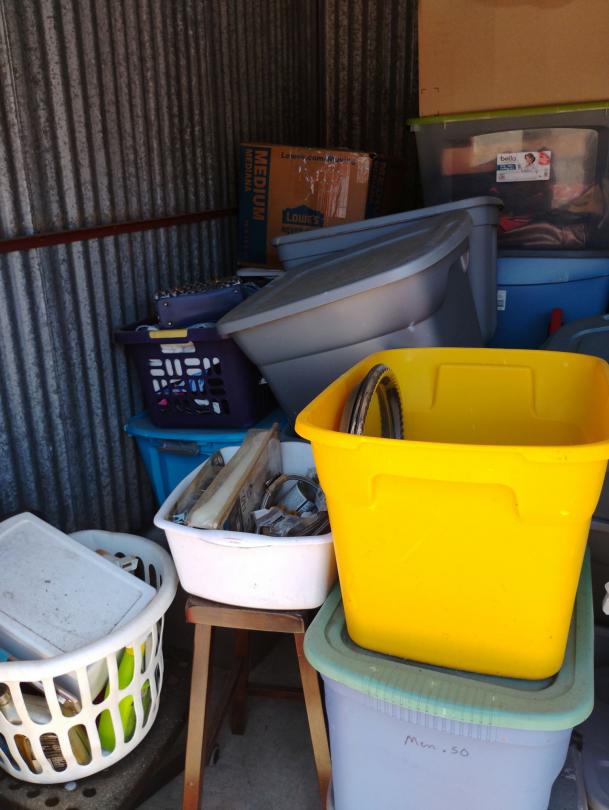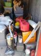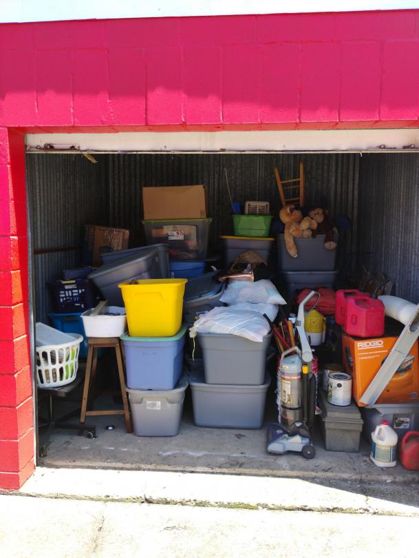 This unit appears to contain…Multiple totes of items, Vacuum cleaner, Gas cans, Life jacket, Stuff animals, Baby beds, Lounge chair, Paint, Lawn tools
