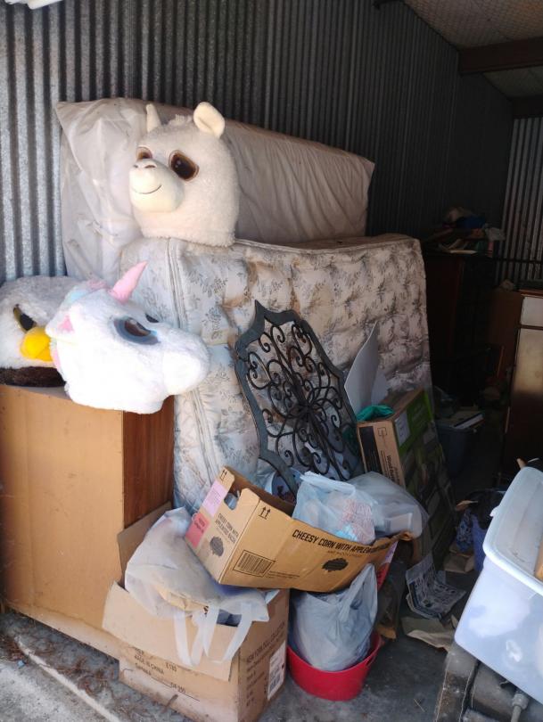 This unit appears to contain…Chair Dresser, Multiple Boxes, Box Spring, mattress, Children chair, Stuff animals, Boots, Ladder,
