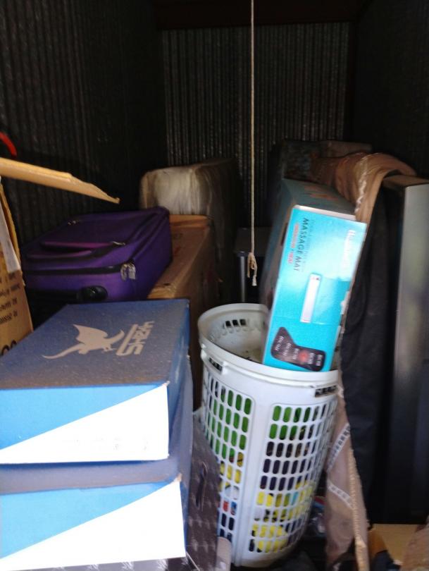 This unit appears to contain…Electric stove, Boxes of items, women shoes, Rug, Picture holder, Flat screen tv, Luggage