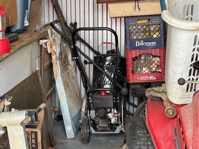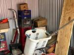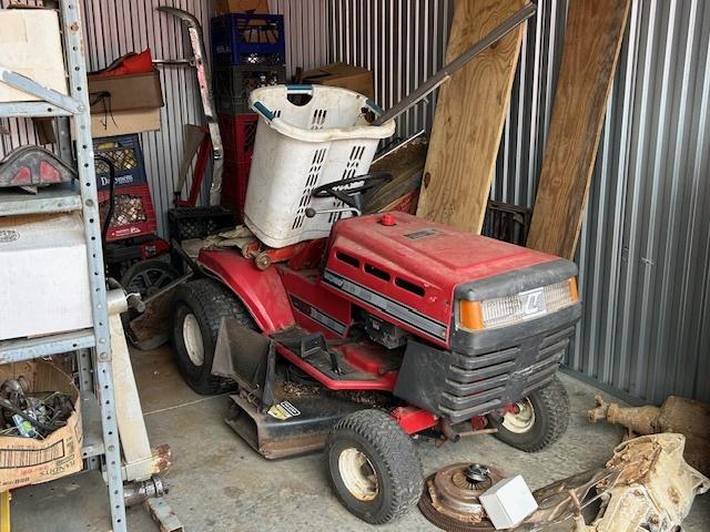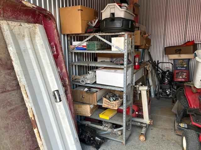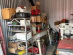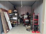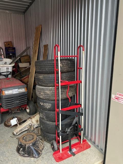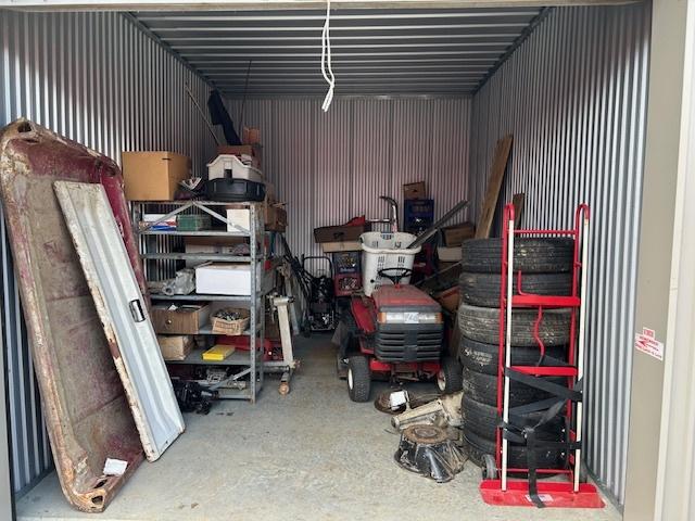 This unit appears to contain…Drive-Up Access, riding mower, appliance dolly, garage items, shelving