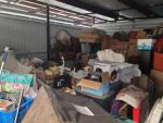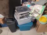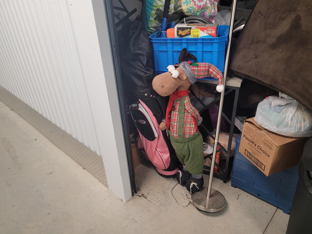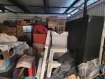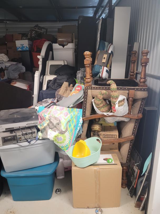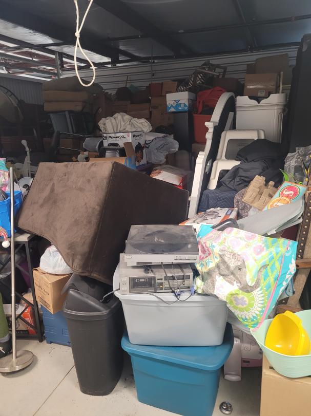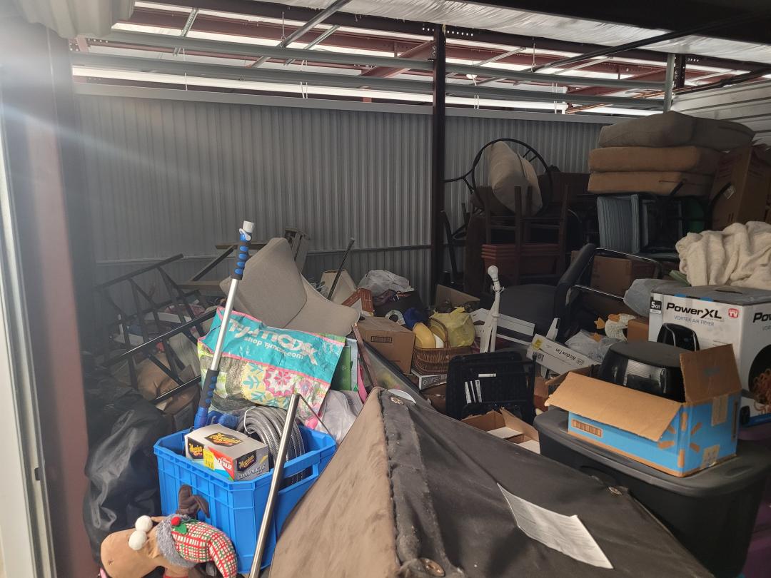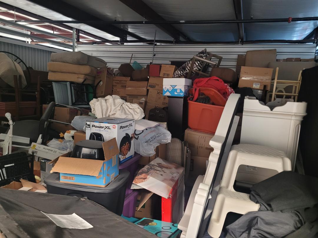 This unit appears to contain…Boxes, Mattress, Bed Frame, Patio Furniture, Tables, Chairs, Golf Clubs, Fans, Totes, Dressers, Record Player, Speakers