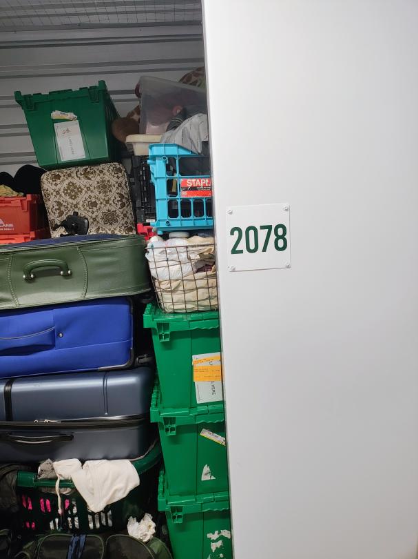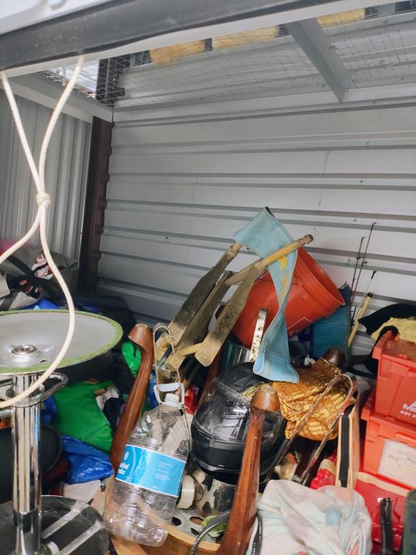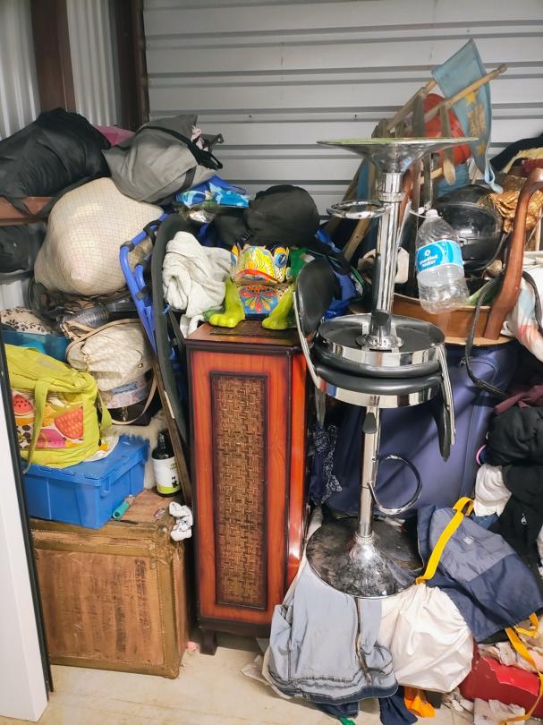This unit appears to contain…Bar Stools, Suitcases, Totes, End table, helmet, fishing rods, trunk, dresser, misc. clothing, buckets