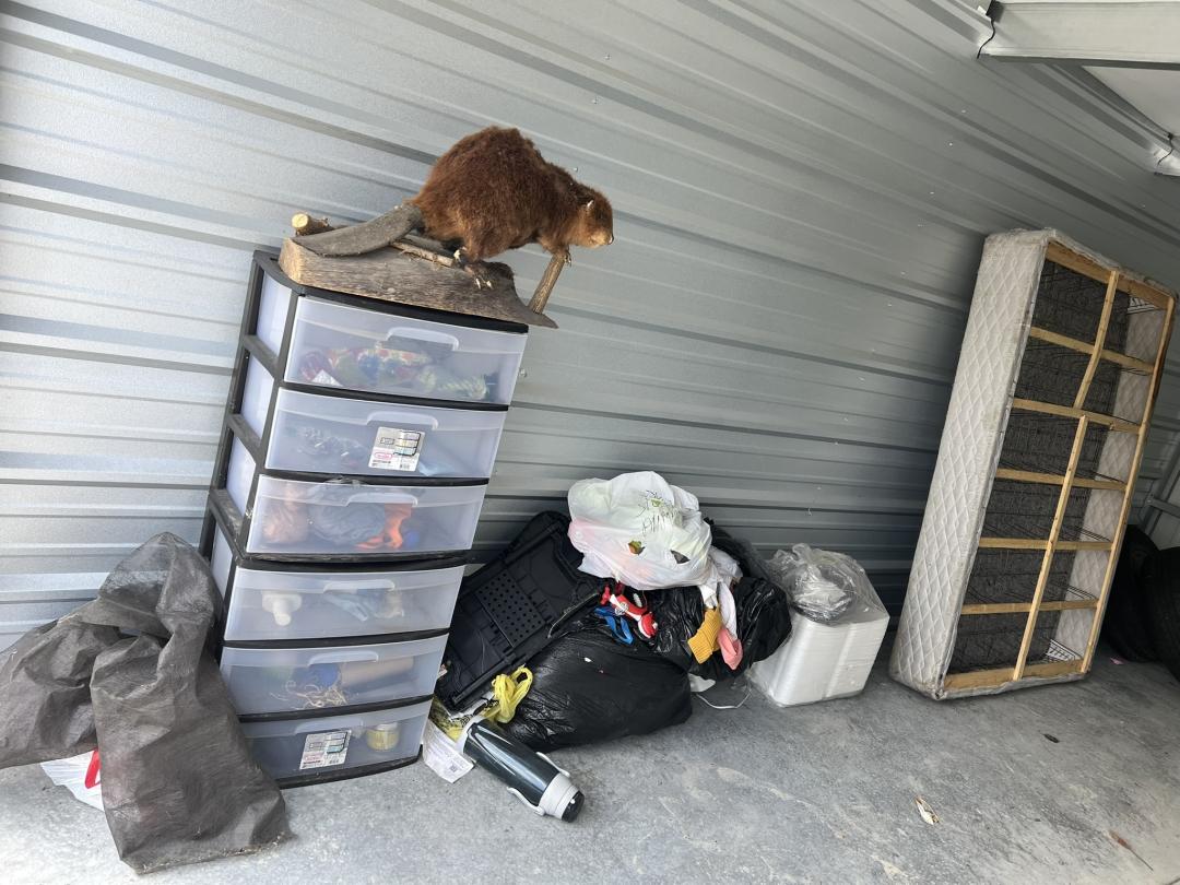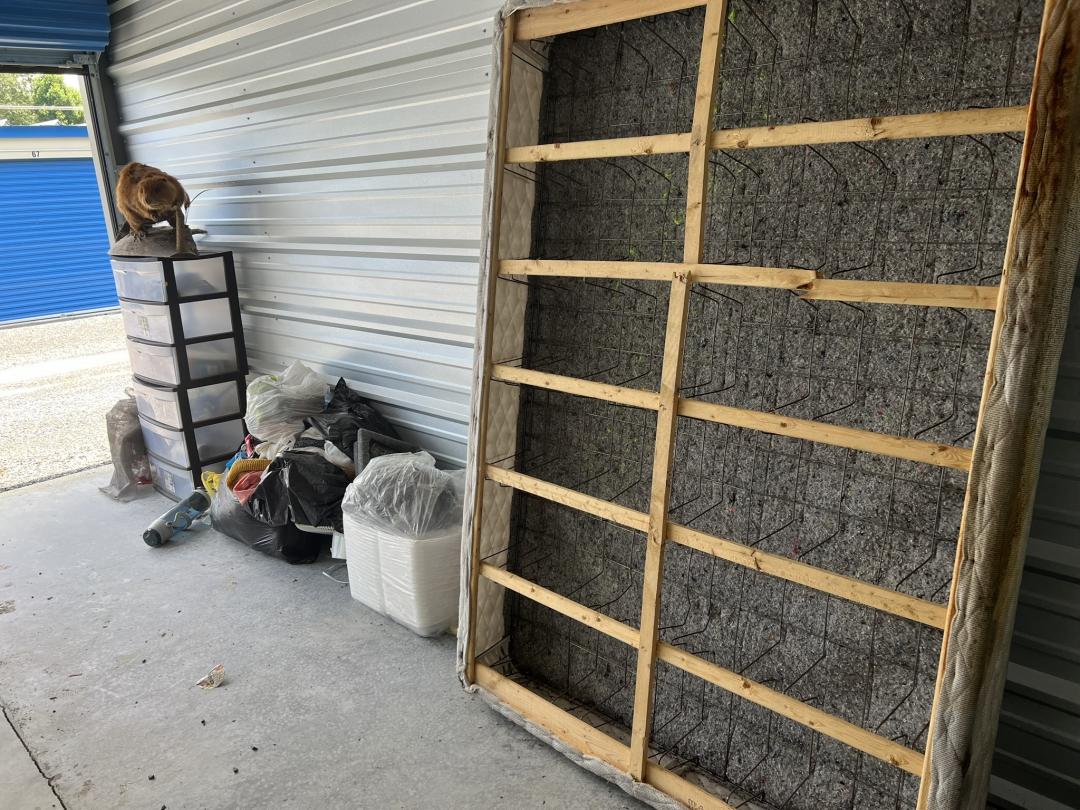 This unit appears to contain…Unit appears to contain: box spring, stuffed beaver- mounted, thermos, tires, portable grill, oil, wooden crate.