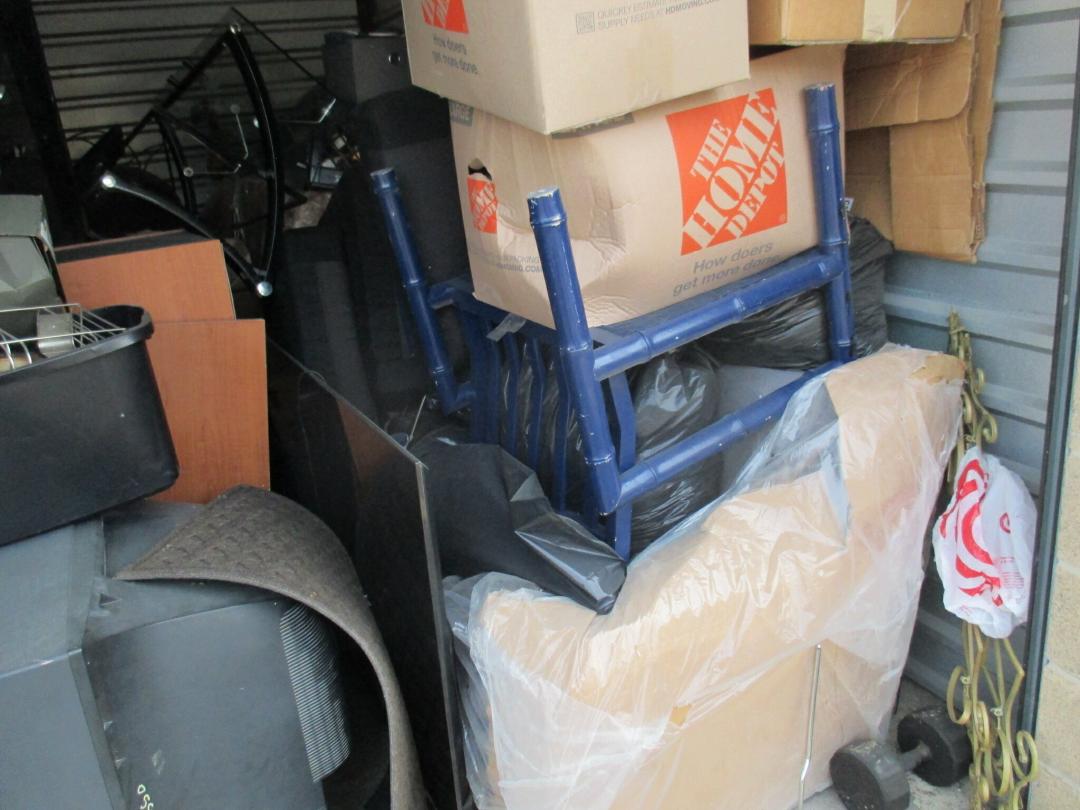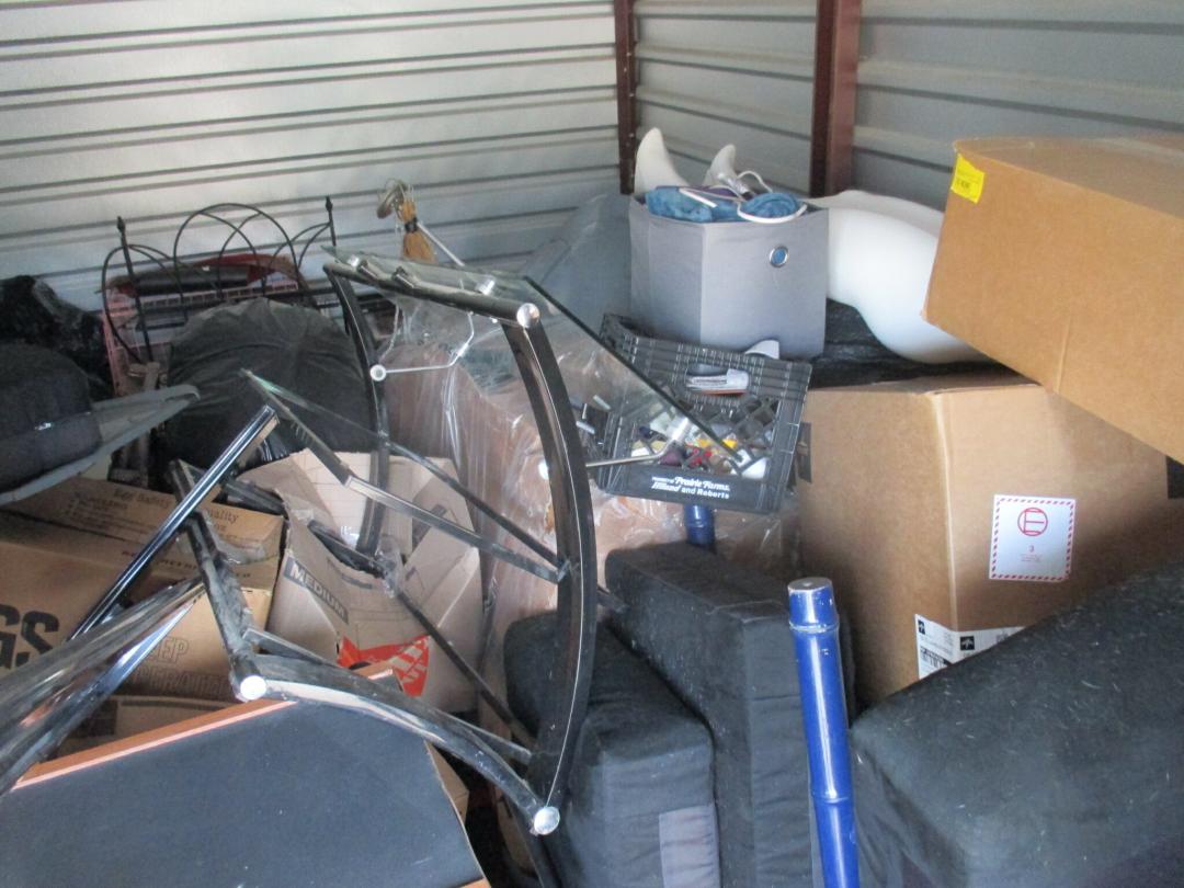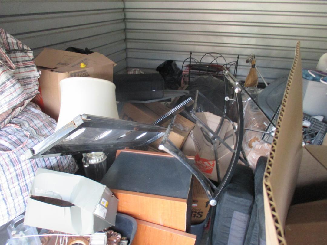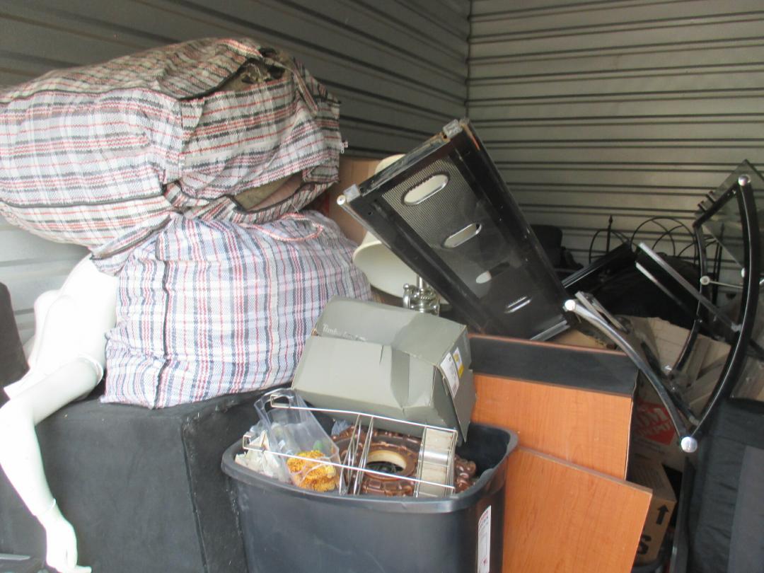 This unit appears to contain…Drive up unit appears to contain bags, boxes, lamp, sofa, love seat, dining room table, tv, weights, tool bag, tv stand, dog cage