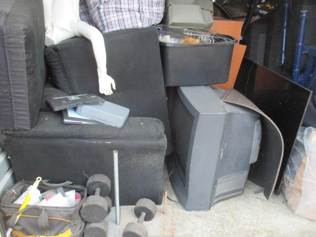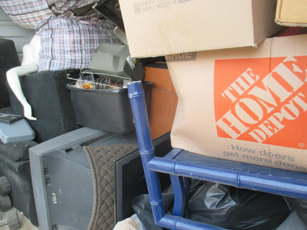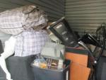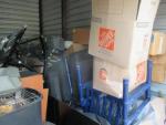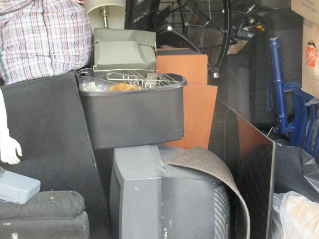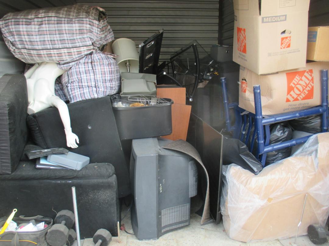 This unit appears to contain…Drive up unit appears to contain bags, boxes, lamp, sofa, love seat, dining room table, tv, weights, tool bag, tv stand, dog cage