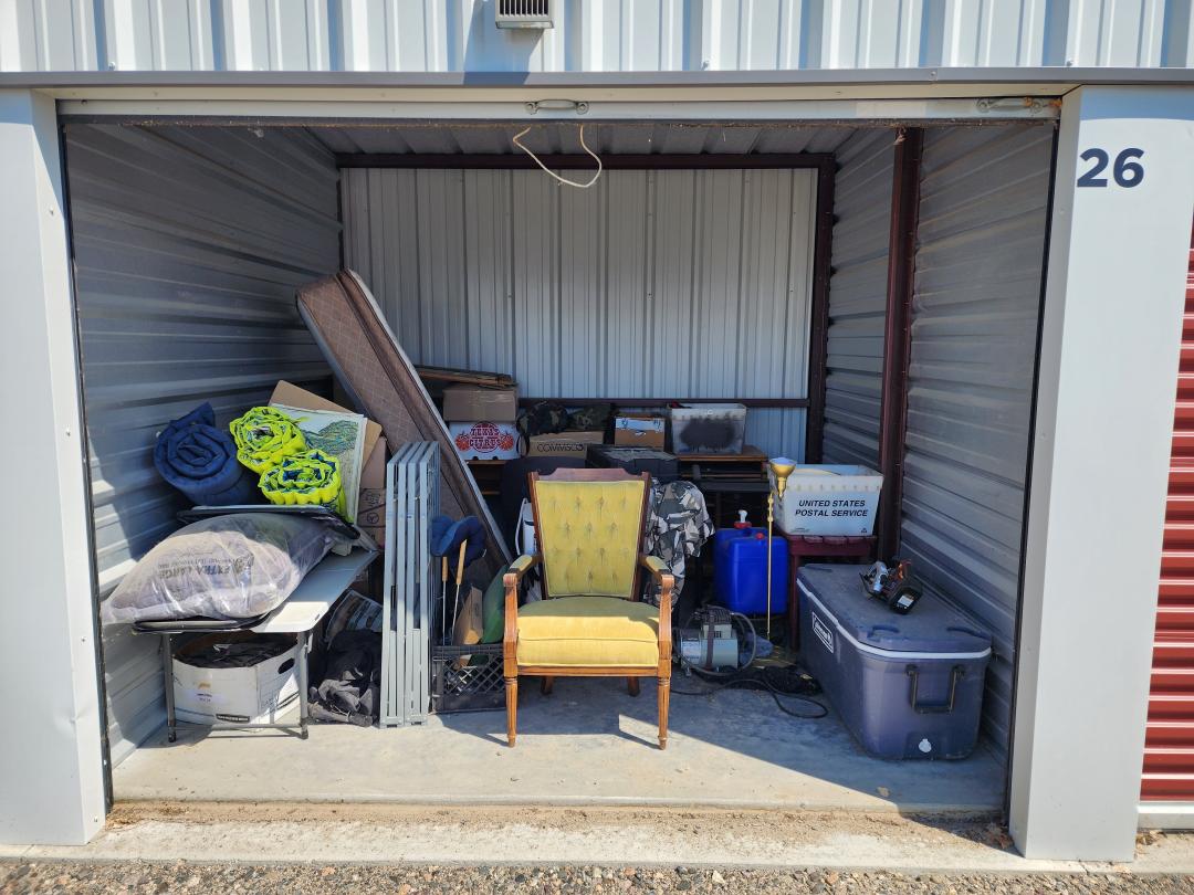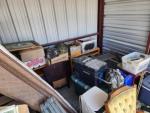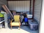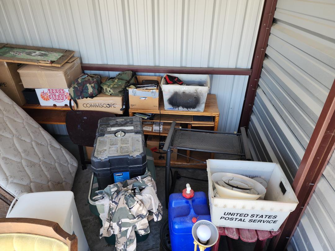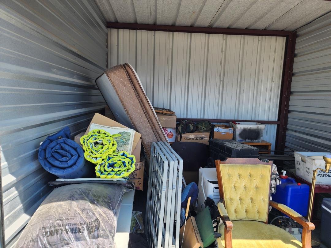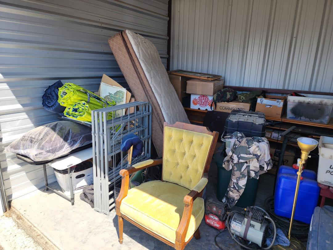 This unit appears to contain…Cot frames, camp gear, wall art, furniture, H/H, tire rim, toolbox, backpacks, computer desks, cooler, lamp, power tools, boxes, compressor paint sprayer kit, water jug, tote, clothes, chair, mattress, sleeping blowup mats, folding table