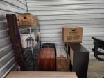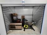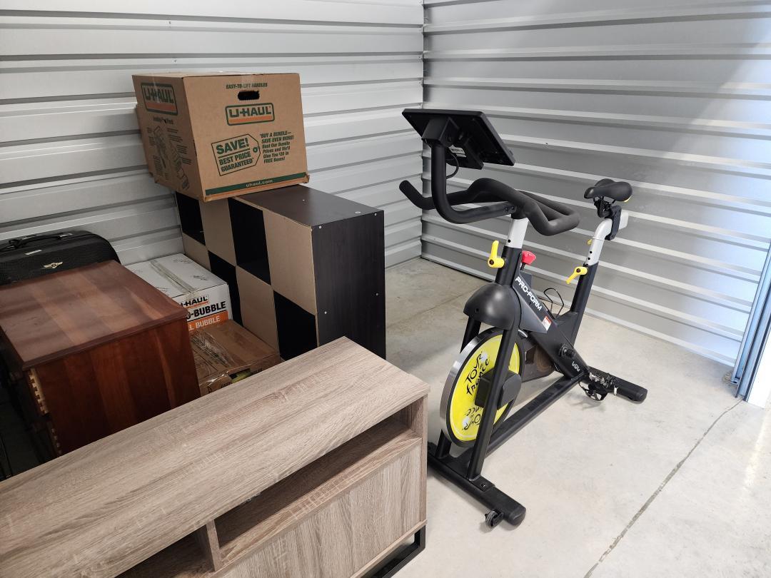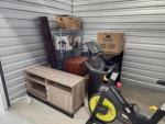 This unit appears to contain…Exercise bike, Tv stand, cube shelf, metal shelf, rug, end table, boxes, suitcase