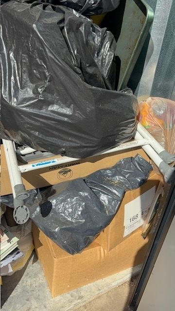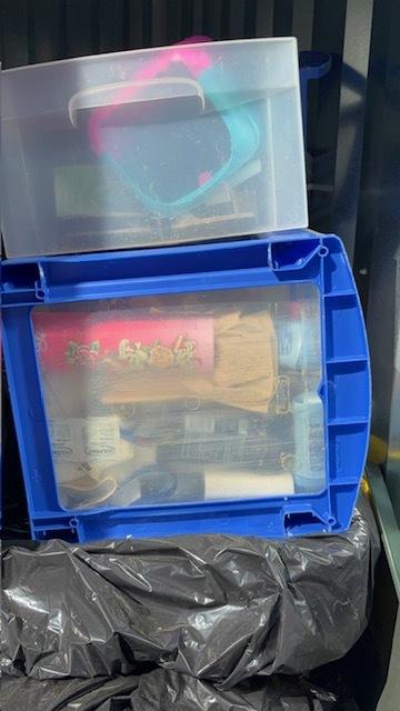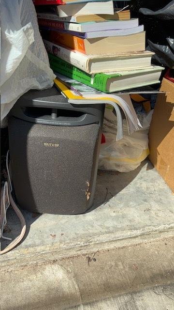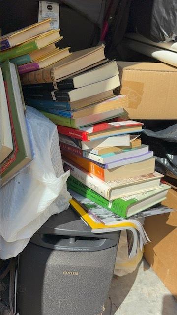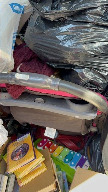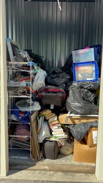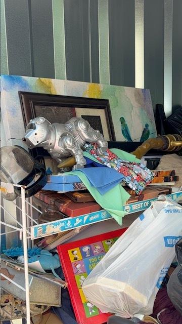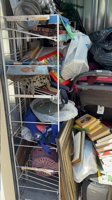 This unit appears to contain…Stroller, step stool, speaker, books, boxes, bins, toys, christmas decor, metal shelving, picture frames, bags, cookie sheet