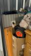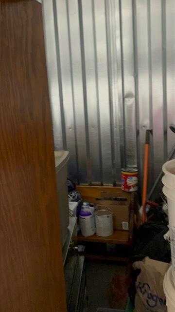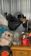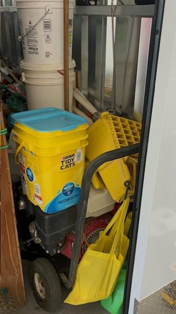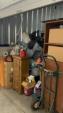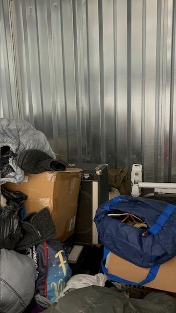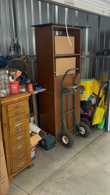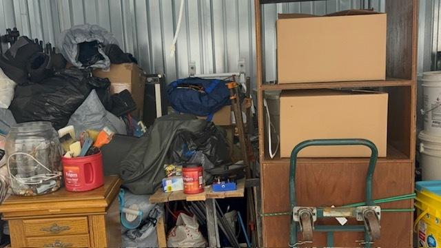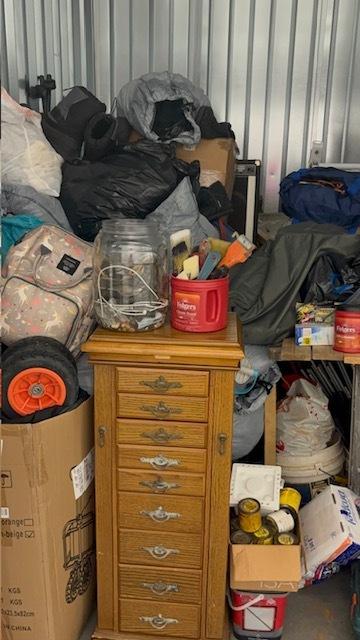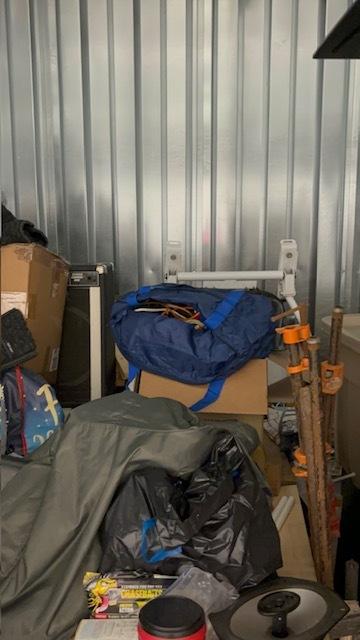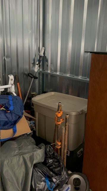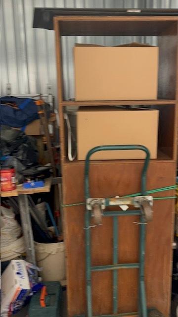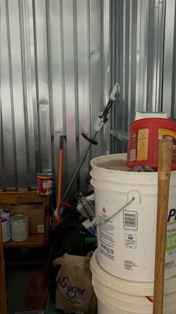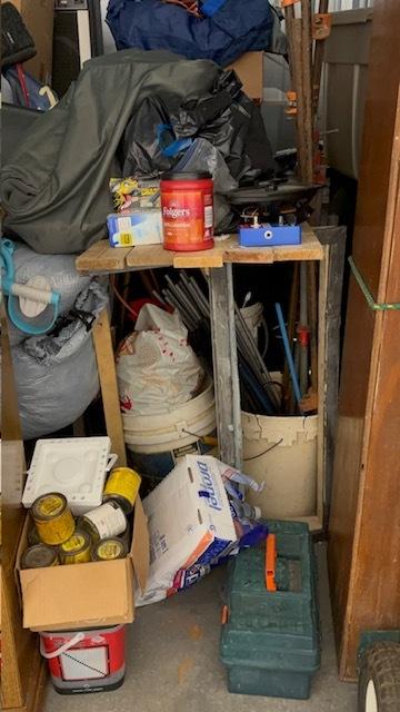 This unit appears to contain…Bookshelf, cabinet, pressure washer, weedeater, tools, dolly, clamps, amp, snowboots, backpacks, bags, clothes, radio, bins, 5 gallon buckets, black decker batteries