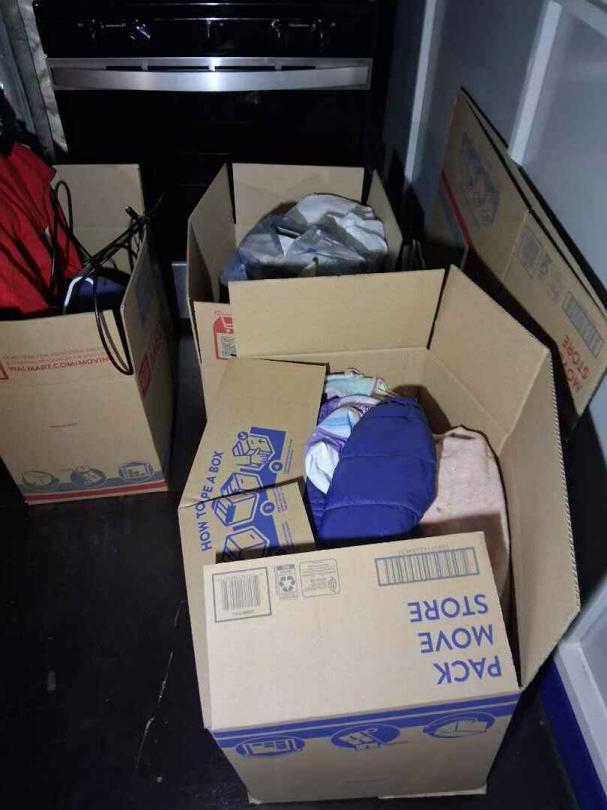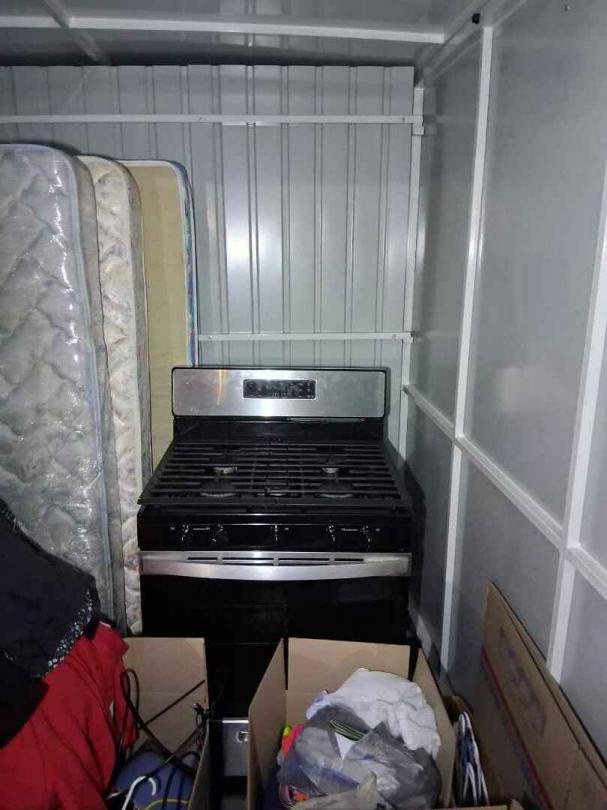 This unit appears to contain…24/7 Access, Drive Up Access, Fenced & Gate, Premium gas stove, a TV mount, three mattresses, along with multiple boxes of clothes and other household items.