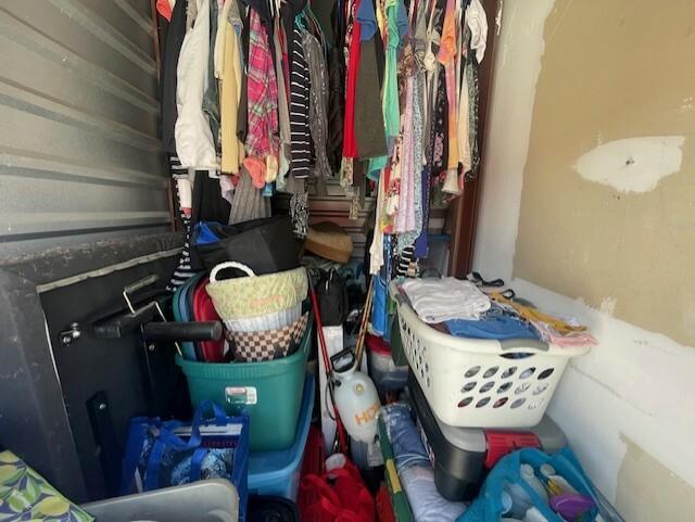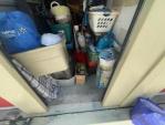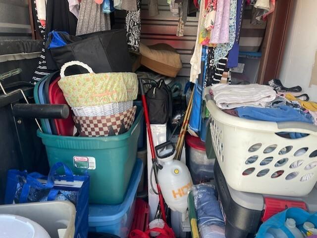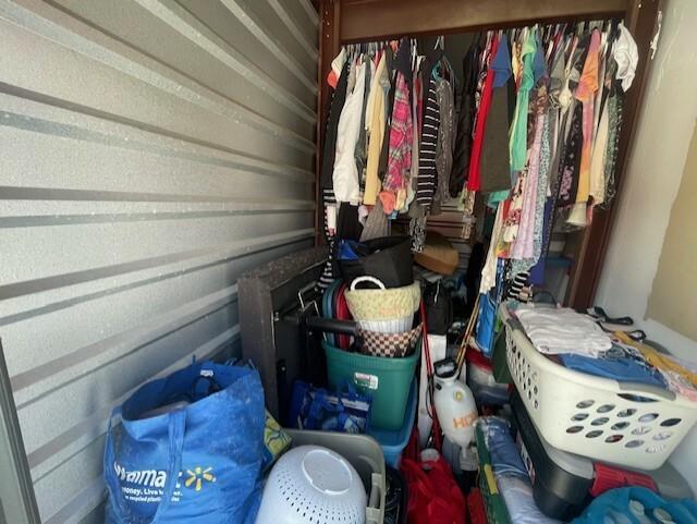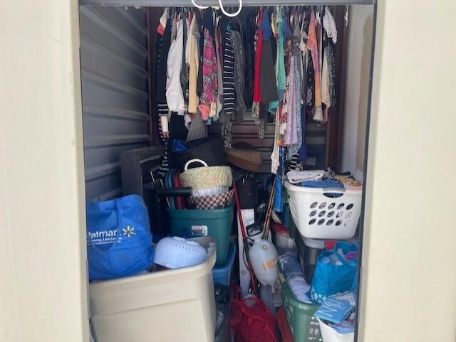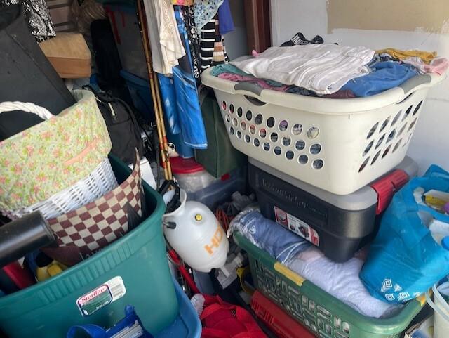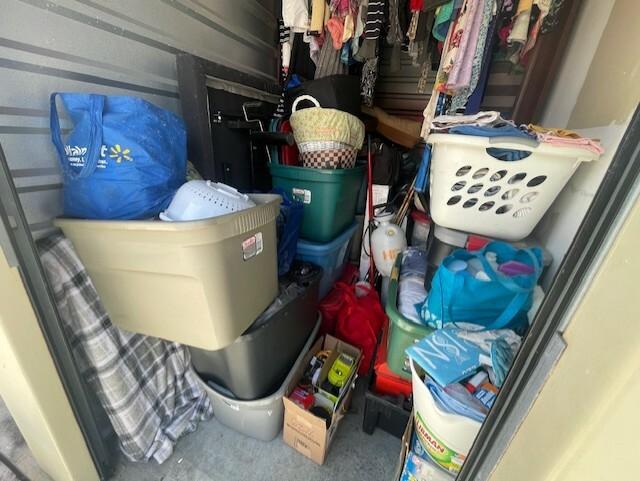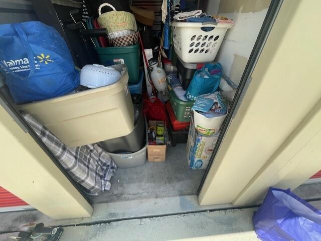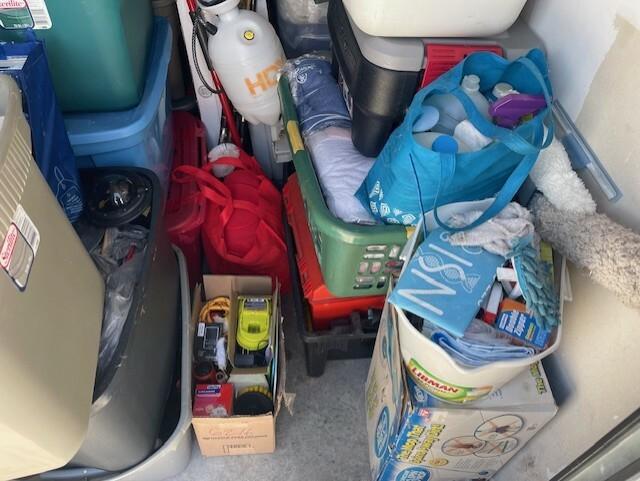 This unit appears to contain…totes clothes kitchen items baskets bedding mop/bucket shelves blanket