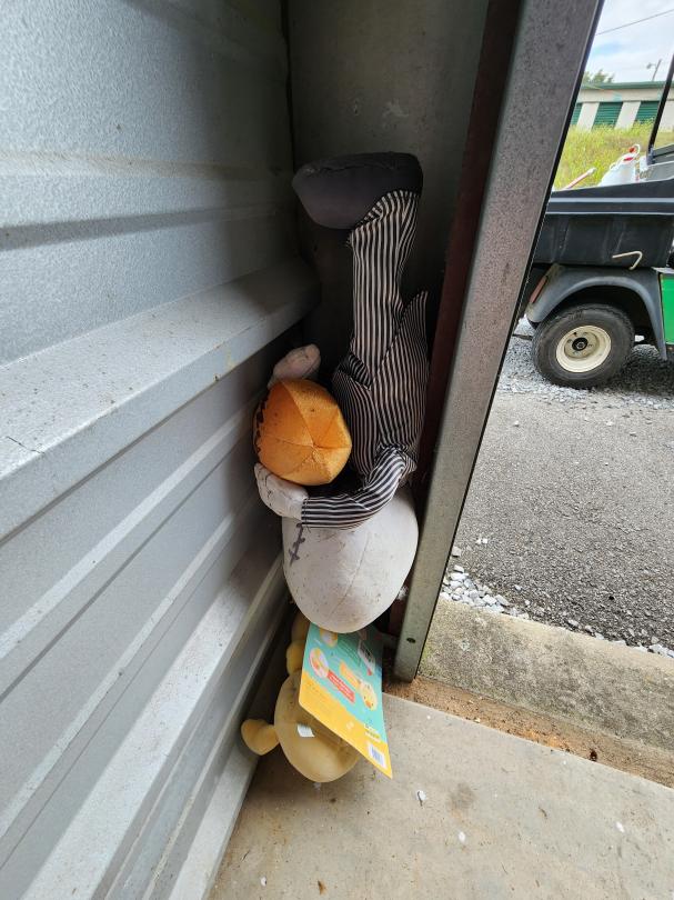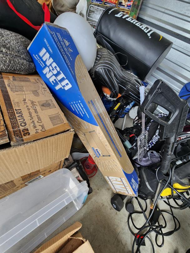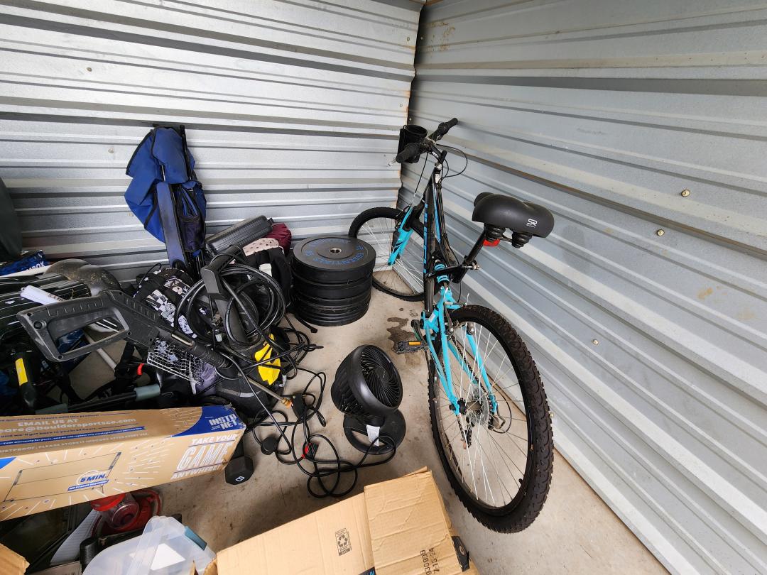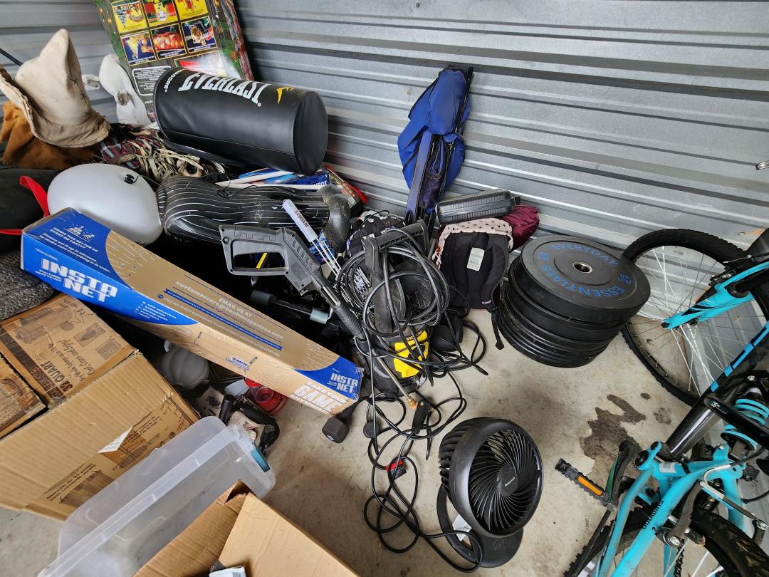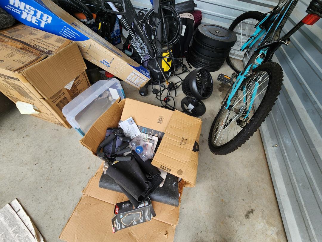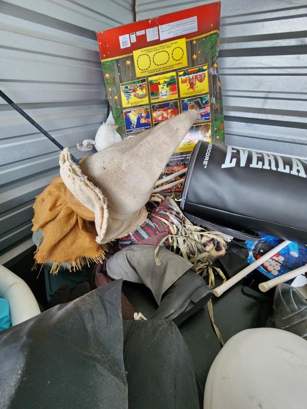 This unit appears to contain…mountain bike, punching bag, halloween decor, lots of Jack Skellington decor, workout equipment, pressure washer, fan, heater, backpacks, recliner, holiday decor, light saber lamp, barbell