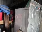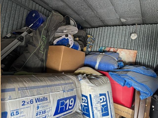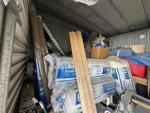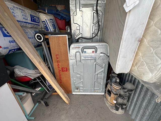 This unit appears to contain…Large Pig Barbeque. 2 washing machines. Golf clubs, Barbers Chair, tool box, house painting sprayer, fiberglass filling bed frame, picture frames, outdoor yard fountain, fans, heater, tarps and other misc. household items.