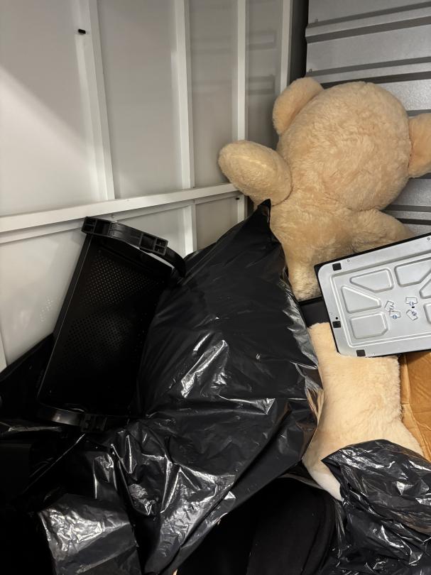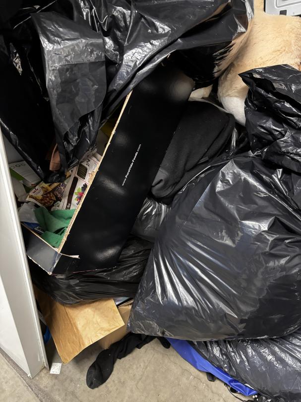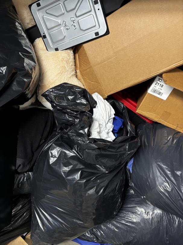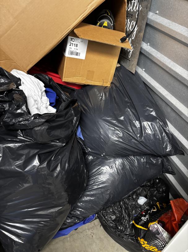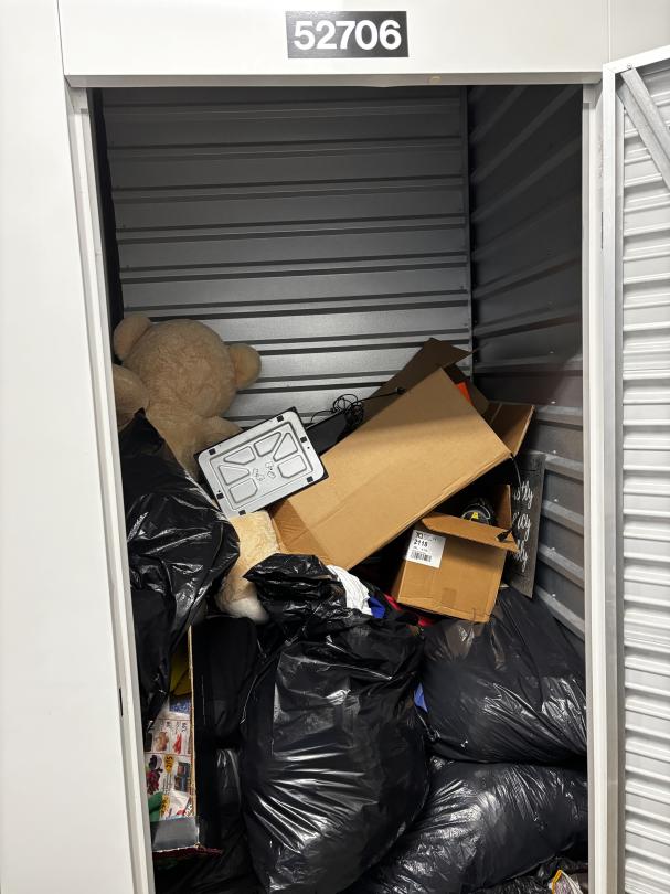 This unit appears to contain…bags, boxes, clothing, shoes, TV