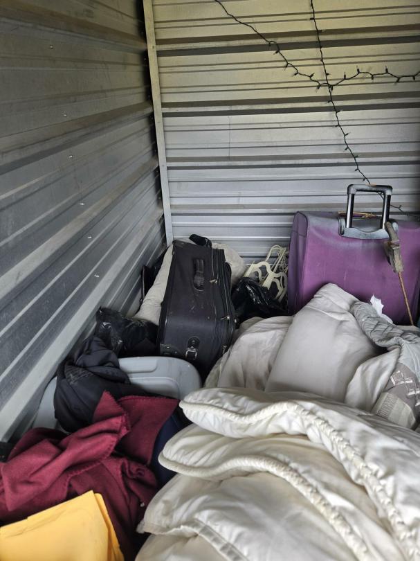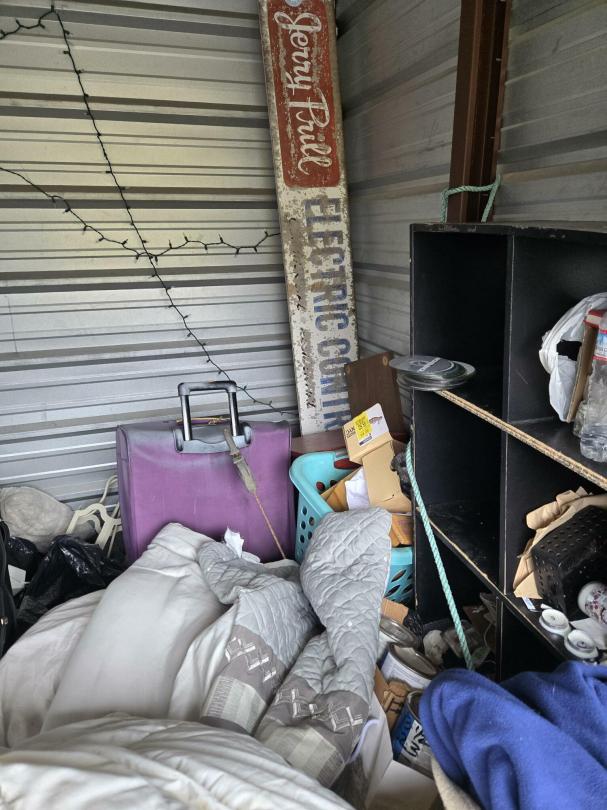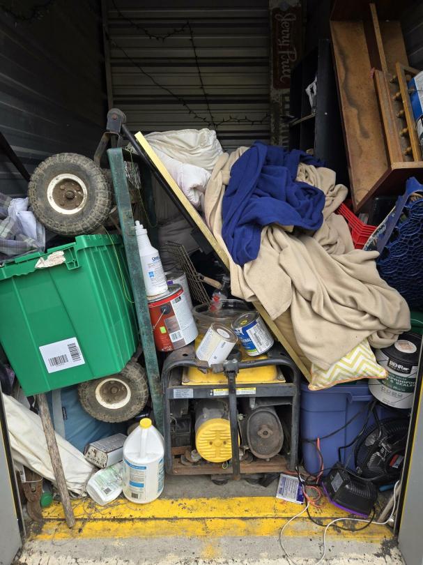 This unit appears to contain…Wooden Shelf, Storage Cubes, Luggage, String Lights, Clothing, Bedding, Sign, Generator, Fans, Paint, Moving Cart, Plastic Bins, Totes