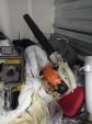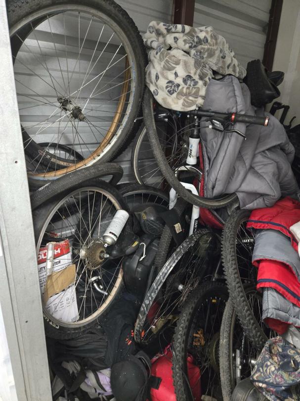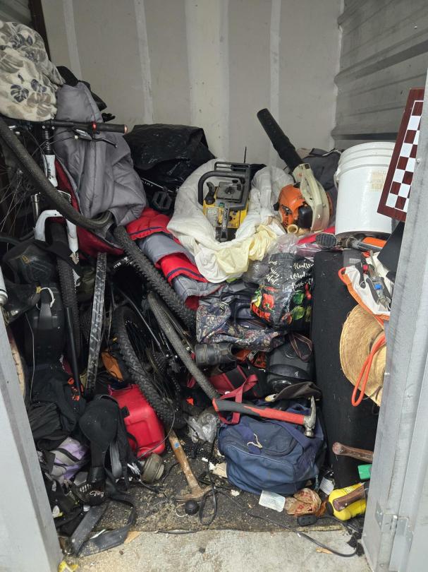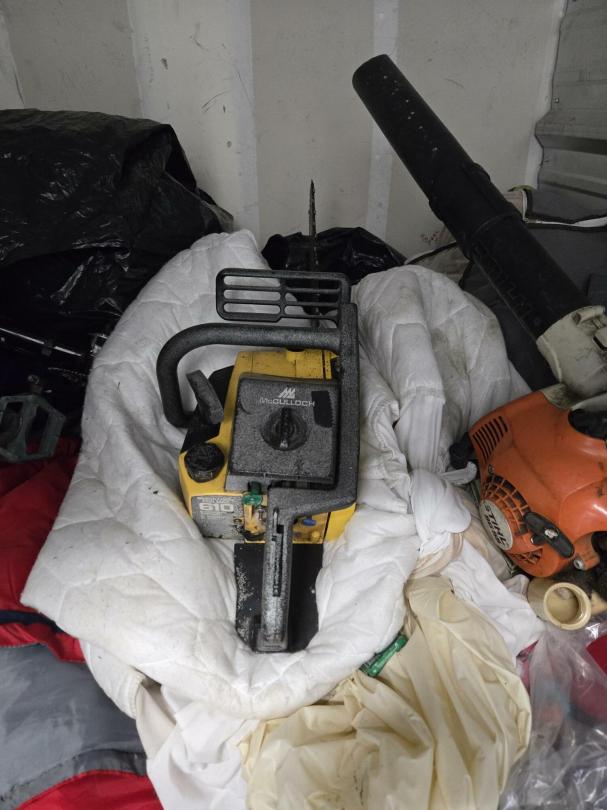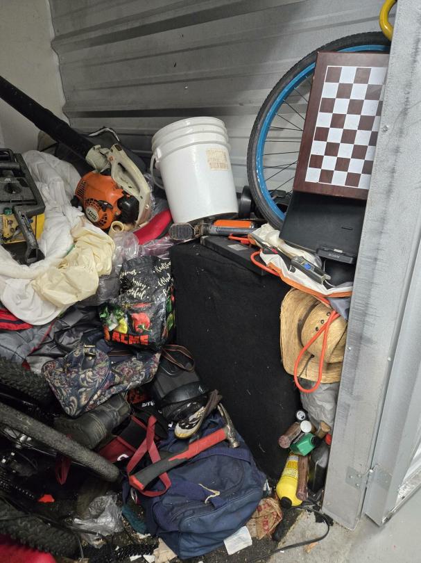 This unit appears to contain…STIHL Blower, McCULLOCH Chainsaw, Bags, Bike parts, Bikes, Tires, Hammer, Bucket, Chess Board, Boots