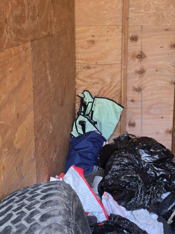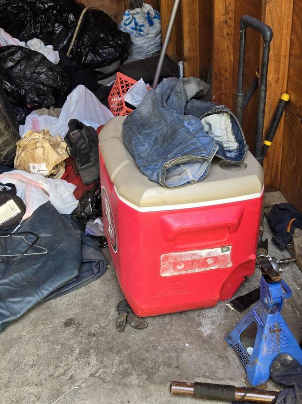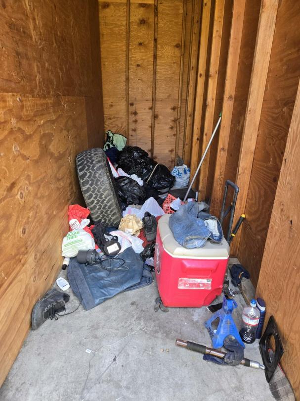 This unit appears to contain…Clothing, Cooler, Car Lift, Camp Chair, Tire, Bags, Tools, Shoes