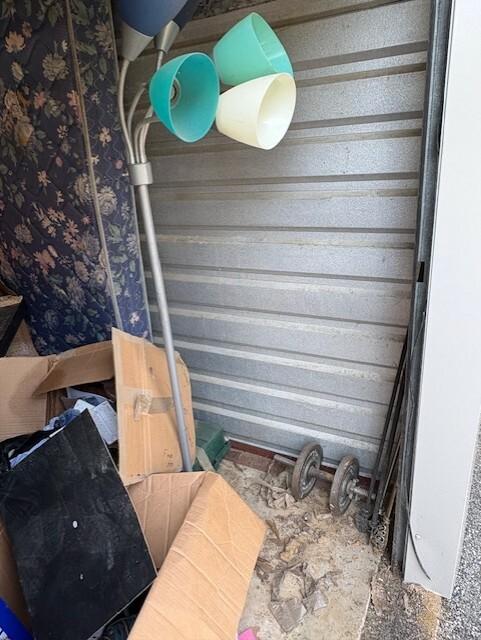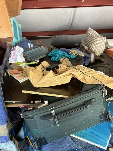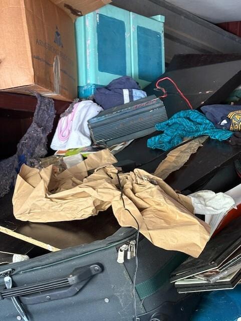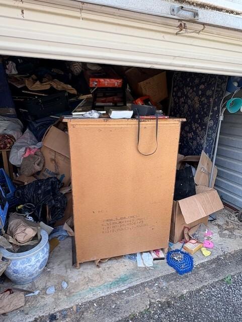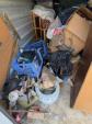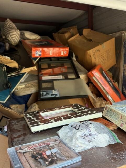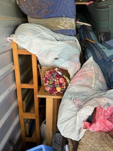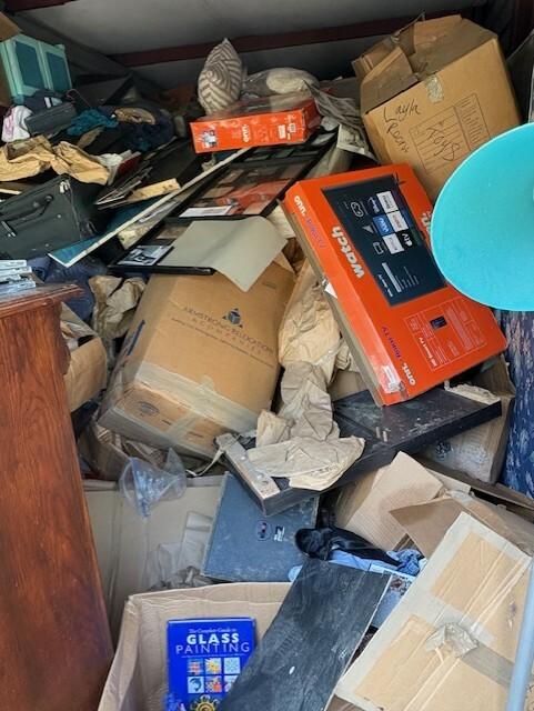 This unit appears to contain…tools, construction supplies, shelves, mattress, box springs, dresser, lamp, table, kitchenware, decor, bags, boxes, clothing, suitcases, purses, misc. items
