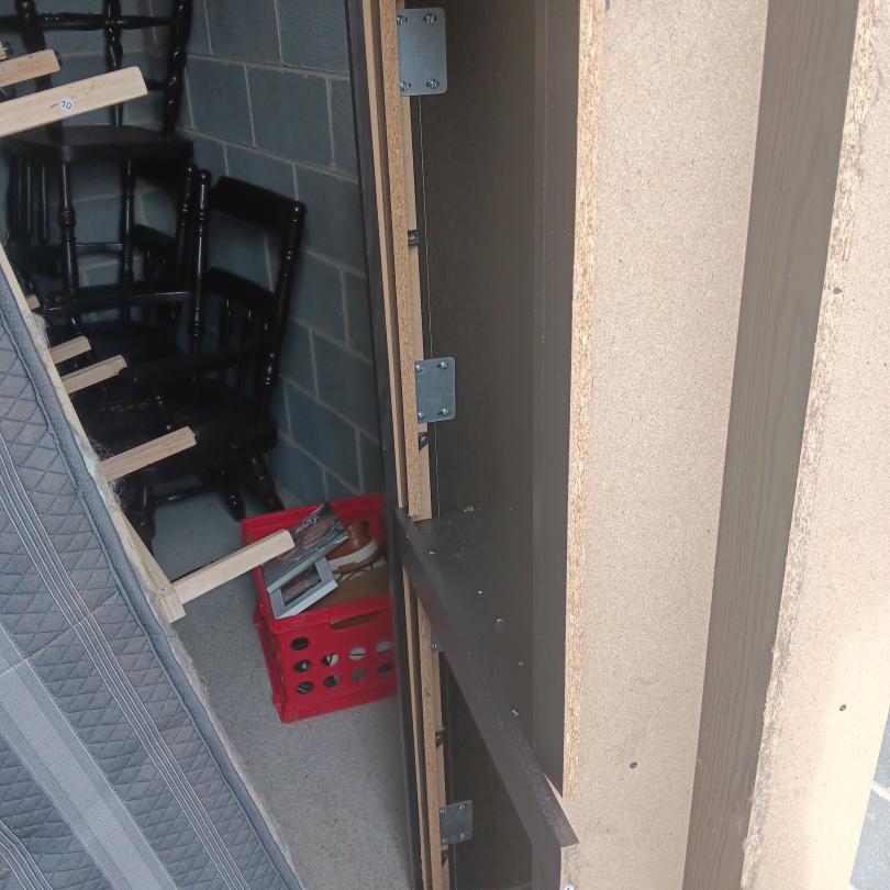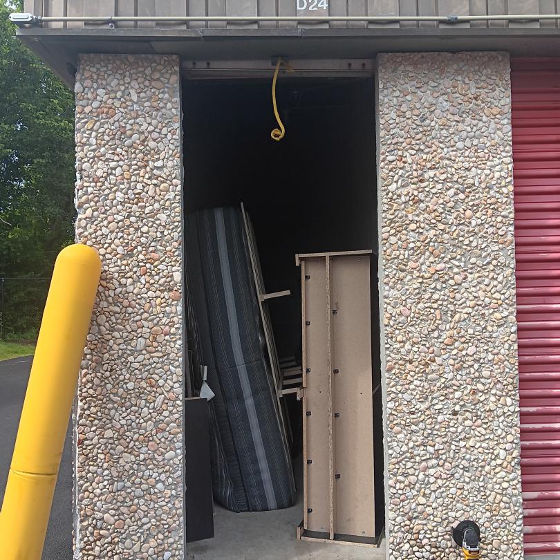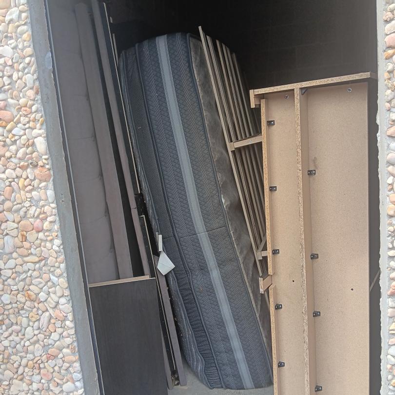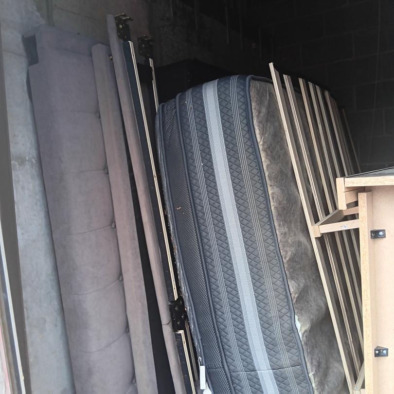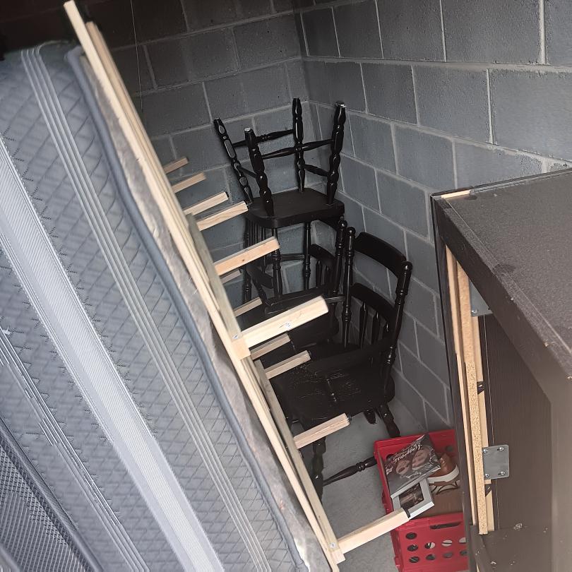 This unit appears to contain…Small unit that has a large mattress and headboard set, a nice set of black chairs, a crate of miscellaneous items, and a small dresser.