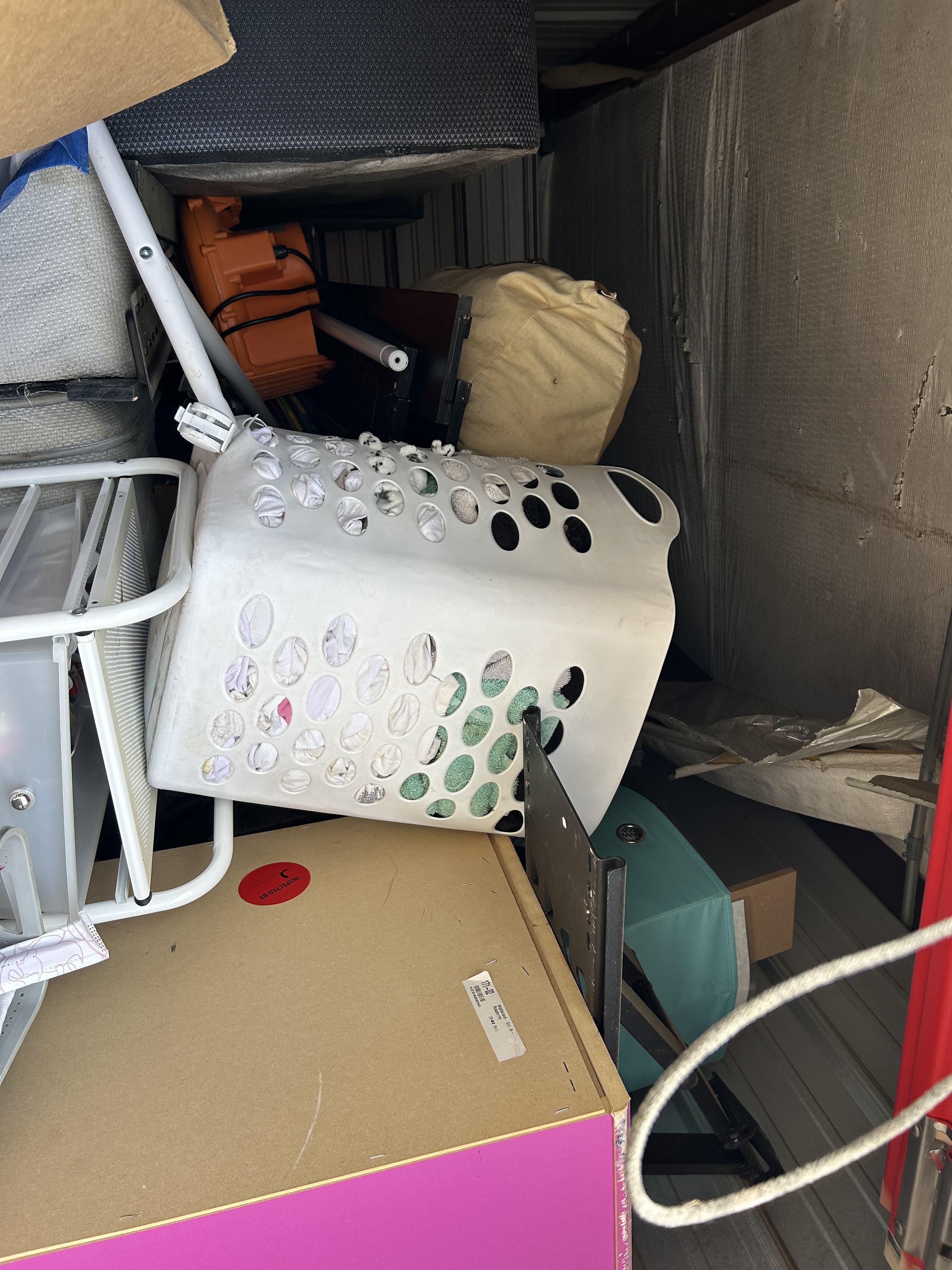 This unit appears to contain…General Storage, Location C. Clothes, storage containers, shelves, laundry baskets.