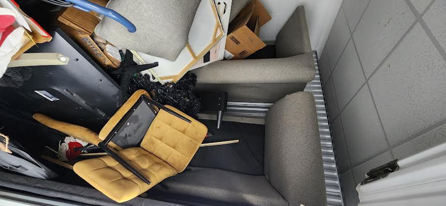 This unit appears to contain…furniture, tv, sofa, headboard, clothes, stick vac, nike shoes in box, several shoe boxes(not able to see inside those) plastic bowls with lids