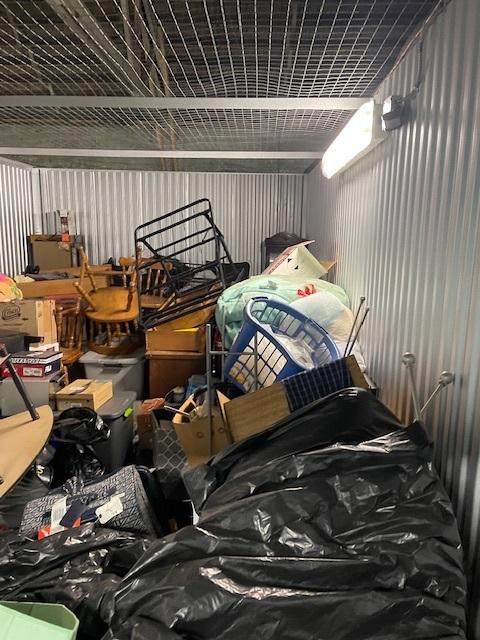 This unit appears to contain…Furniture. lawn mower, cleaning supplies, Appliance